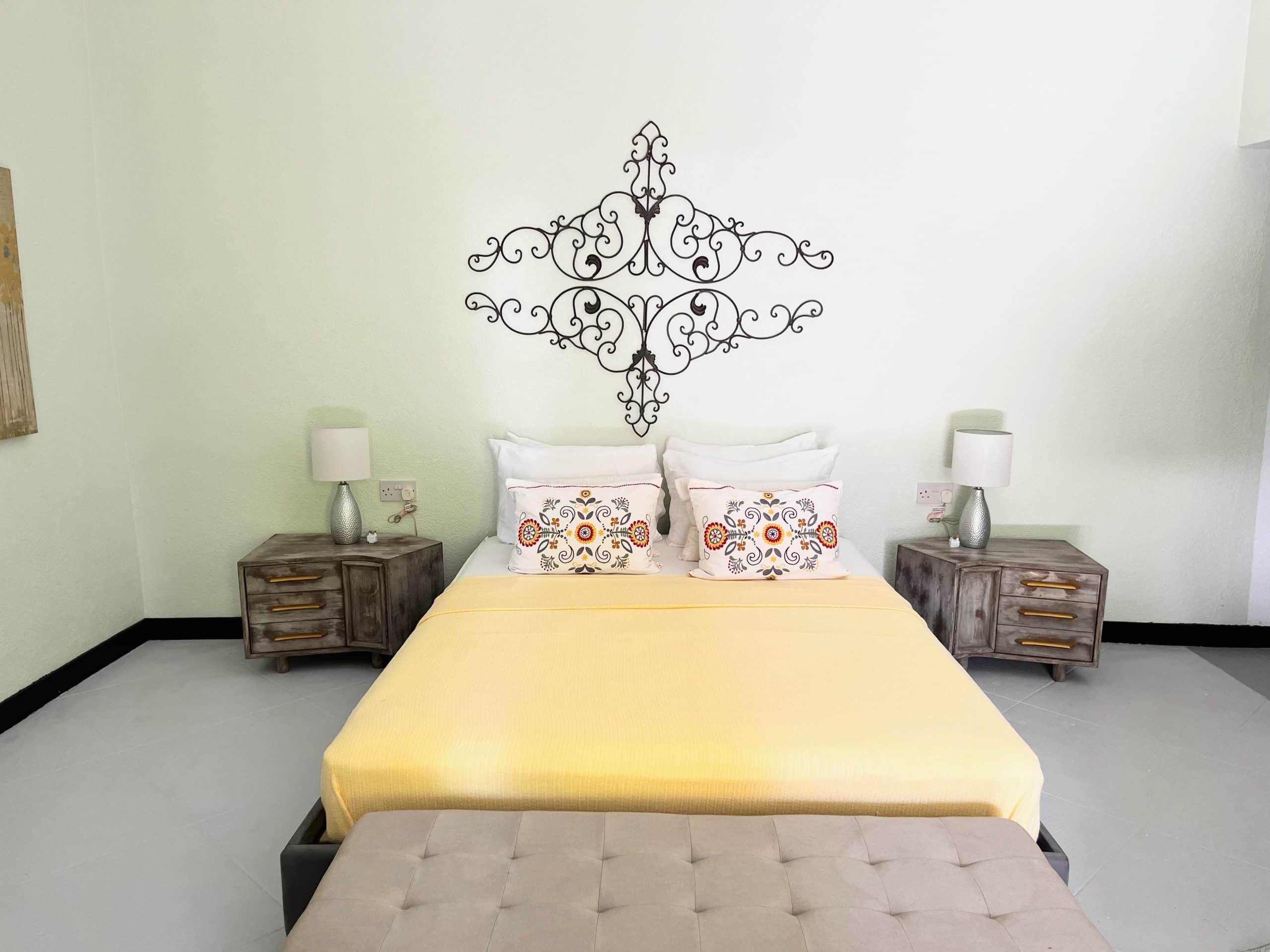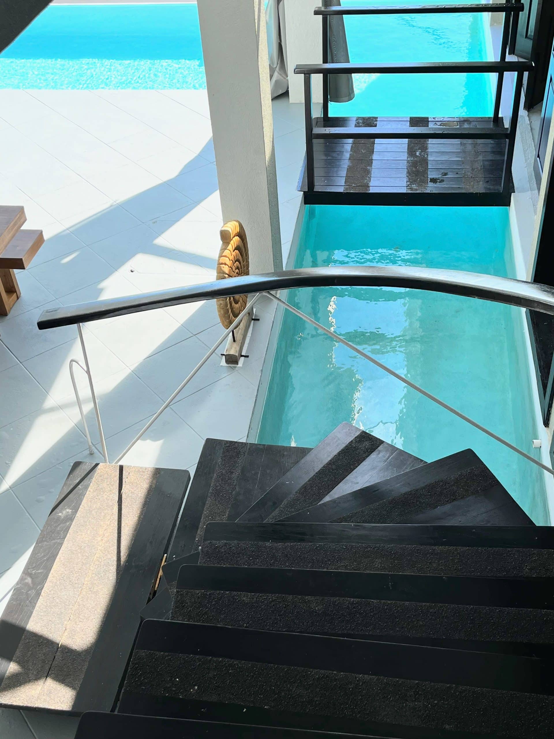 Main Level: The heart of the villa — a generous open-plan kitchen, dining, and lounge area framed on three sides by water. Sliding doors open directly to the stunning infinity pool, blurring the line between indoors and out. Two large en suite bedrooms sit privately at each end of the house, reached by wooden bridges across the pool.