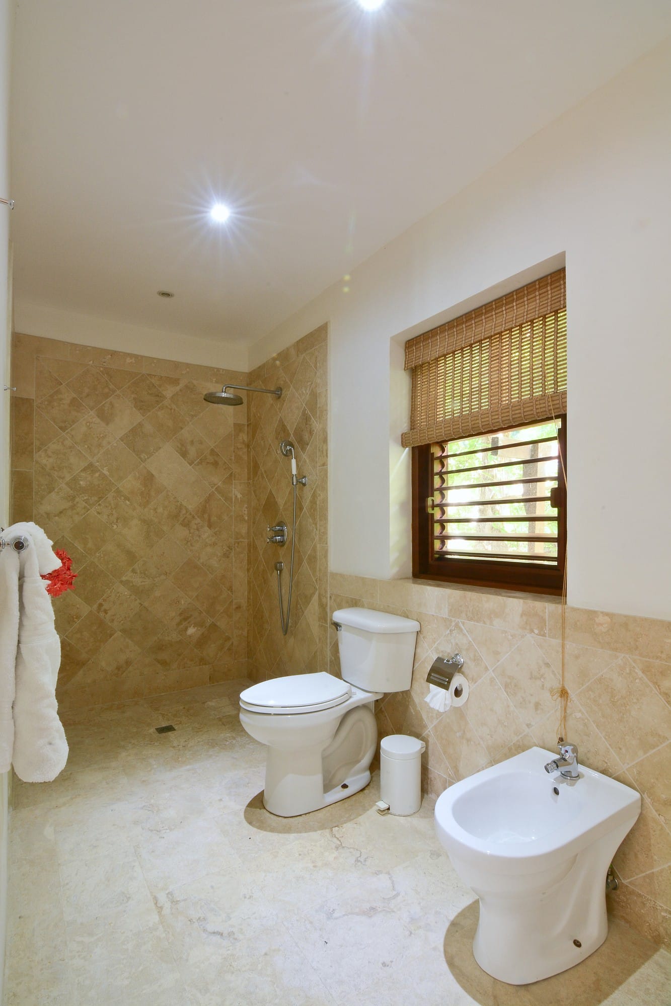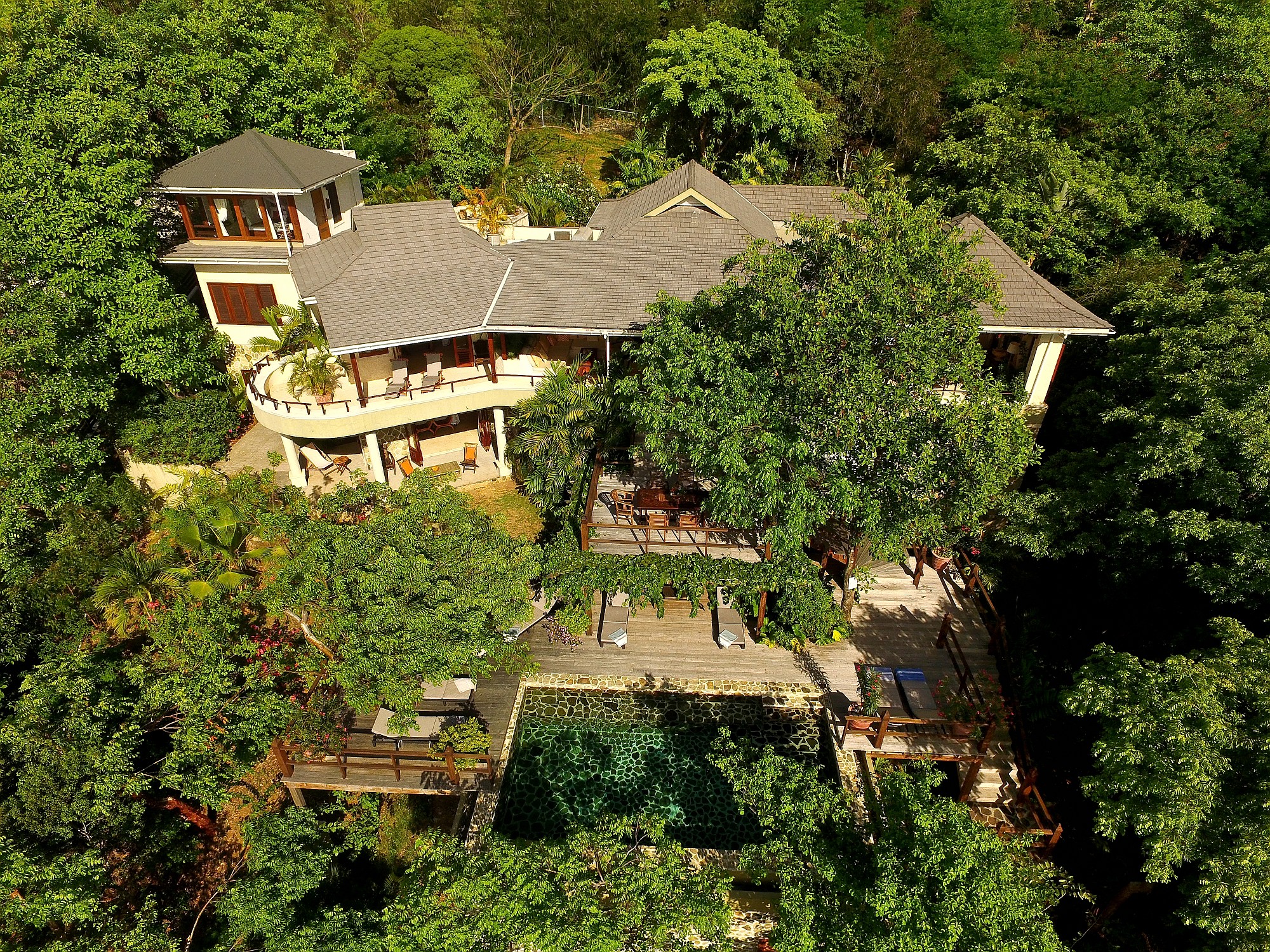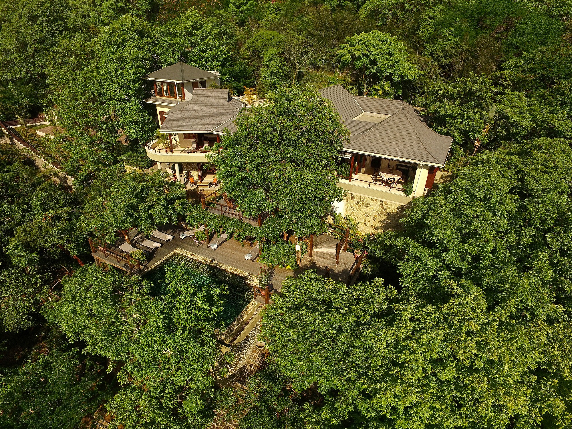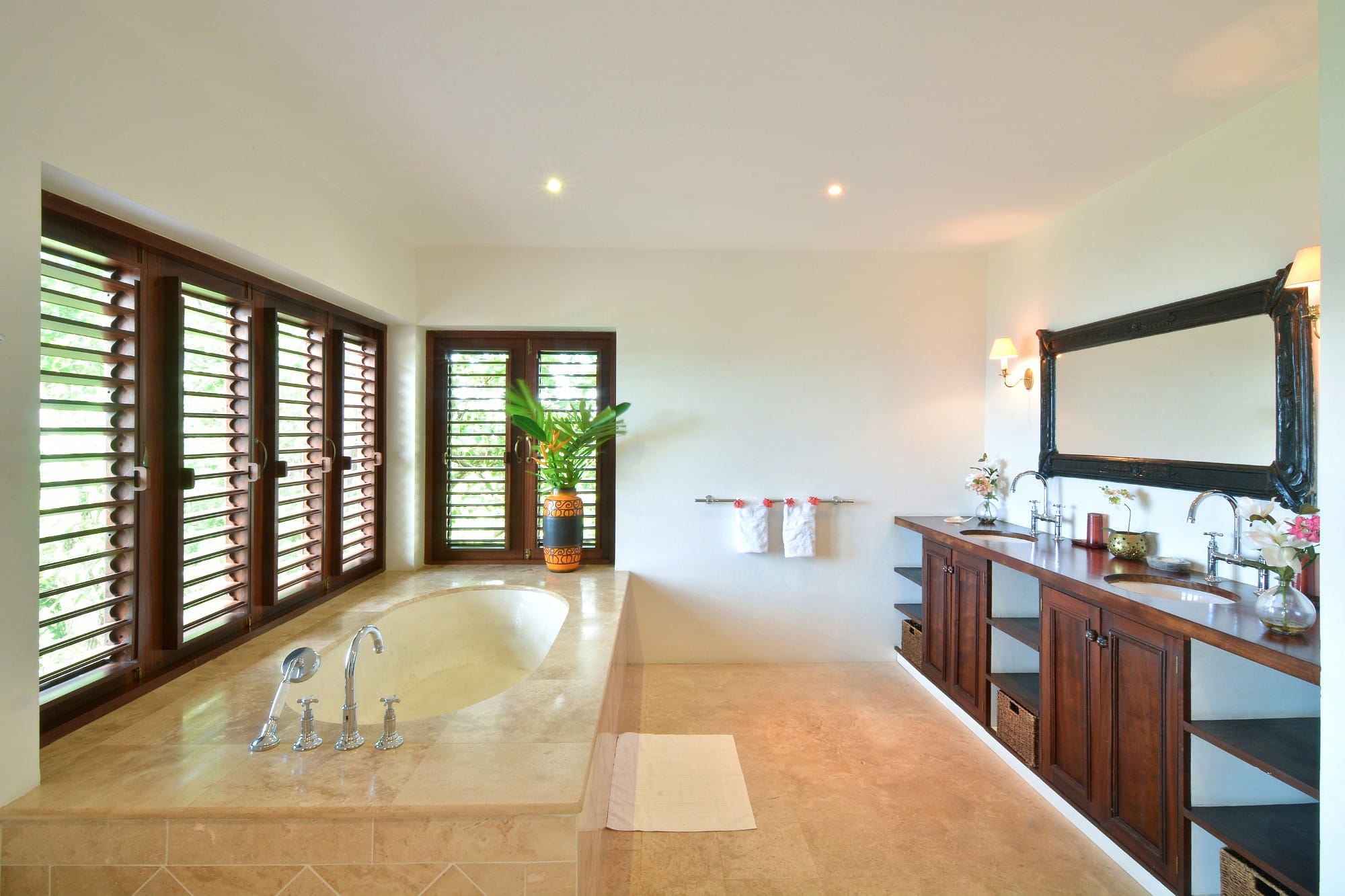 - Two guest bedrooms on the lower level each include en-suite bathrooms and private terraces which also have ocean views. These rooms are accessed via a striking spiral stone staircase and can be arranged as twins or king-size beds.