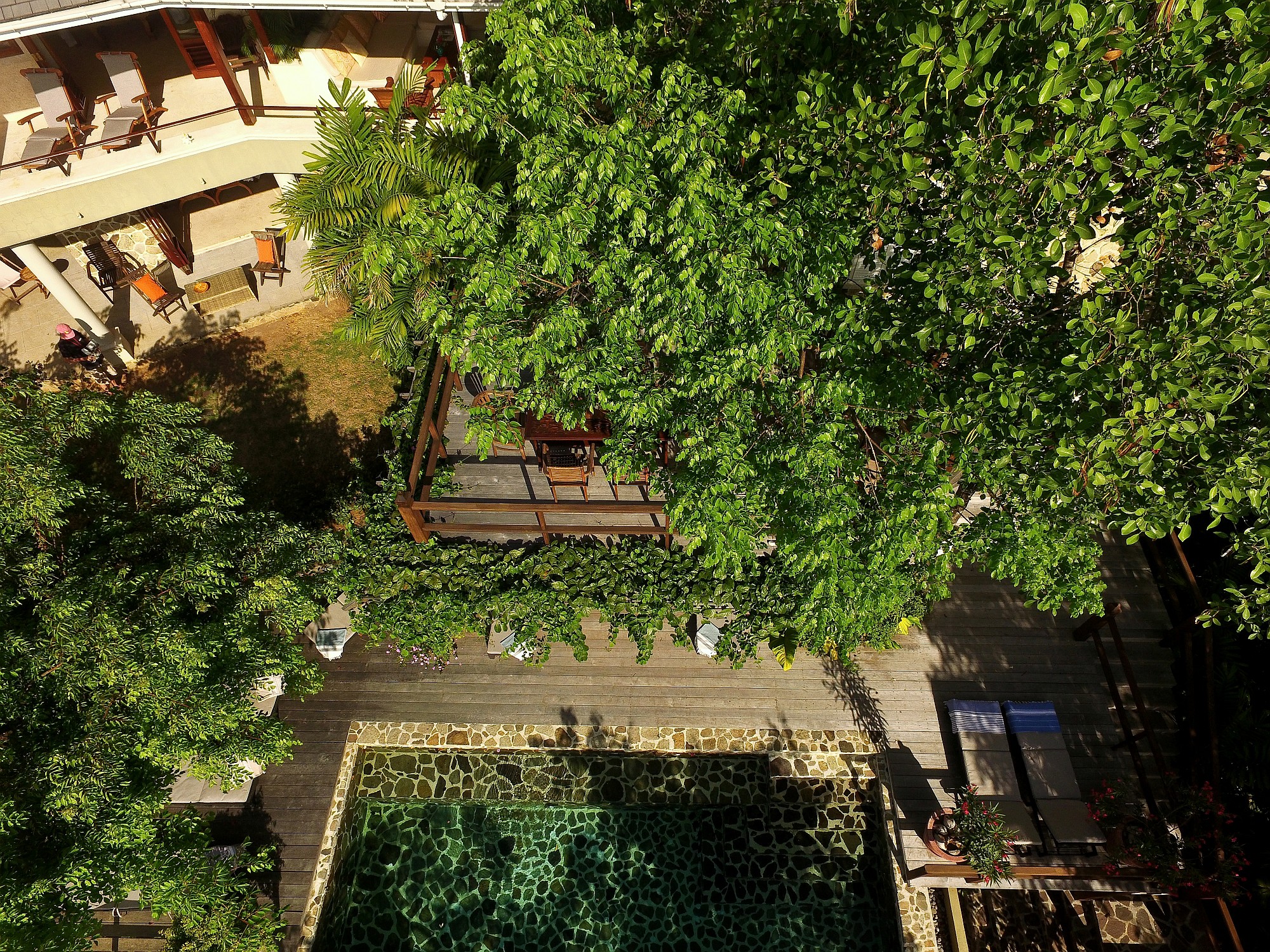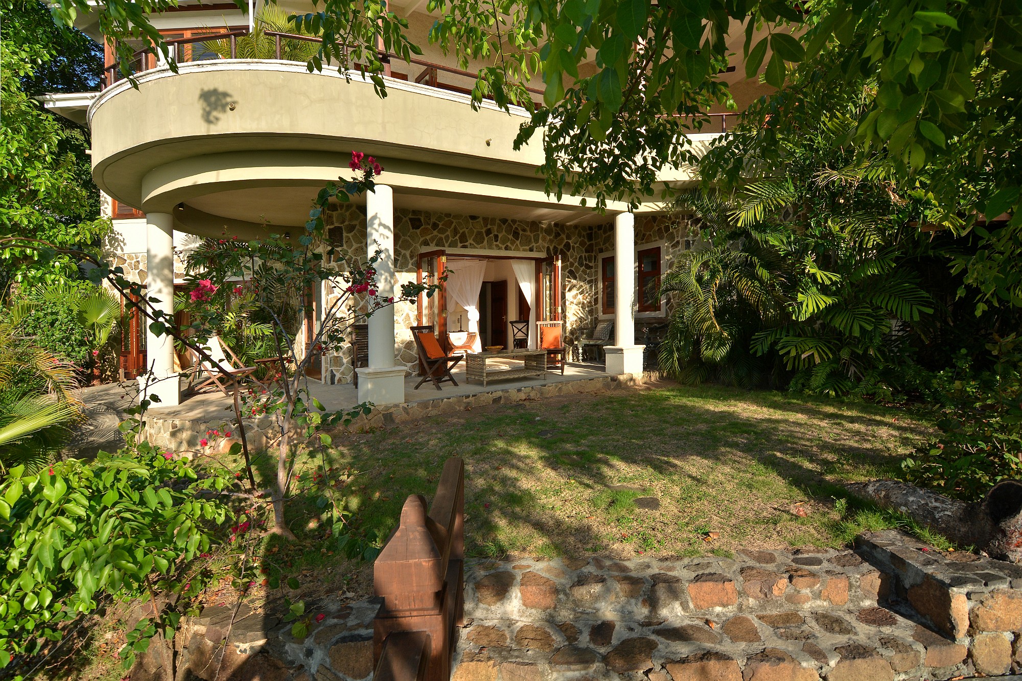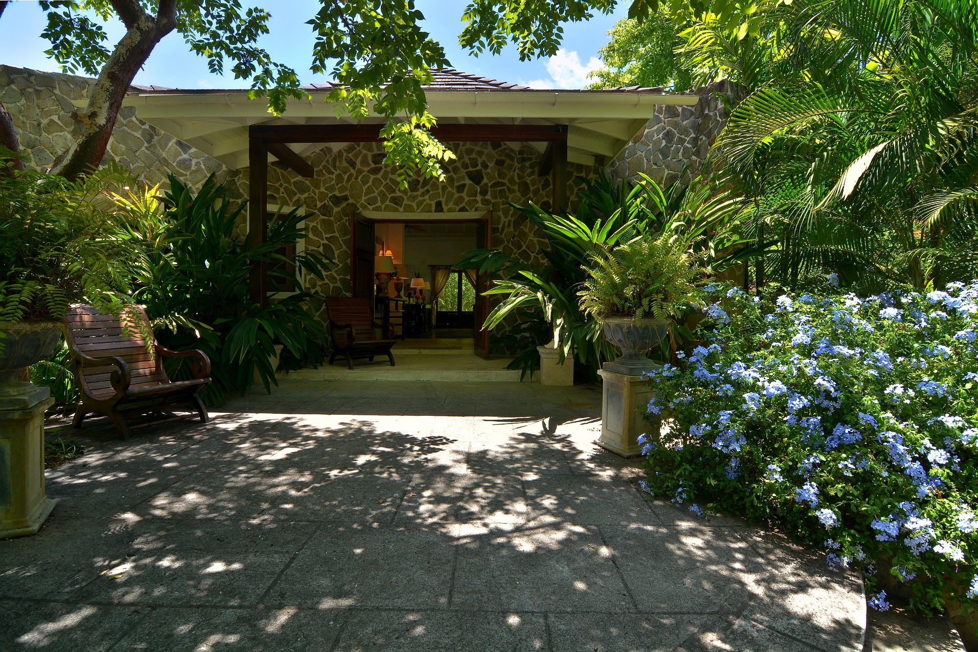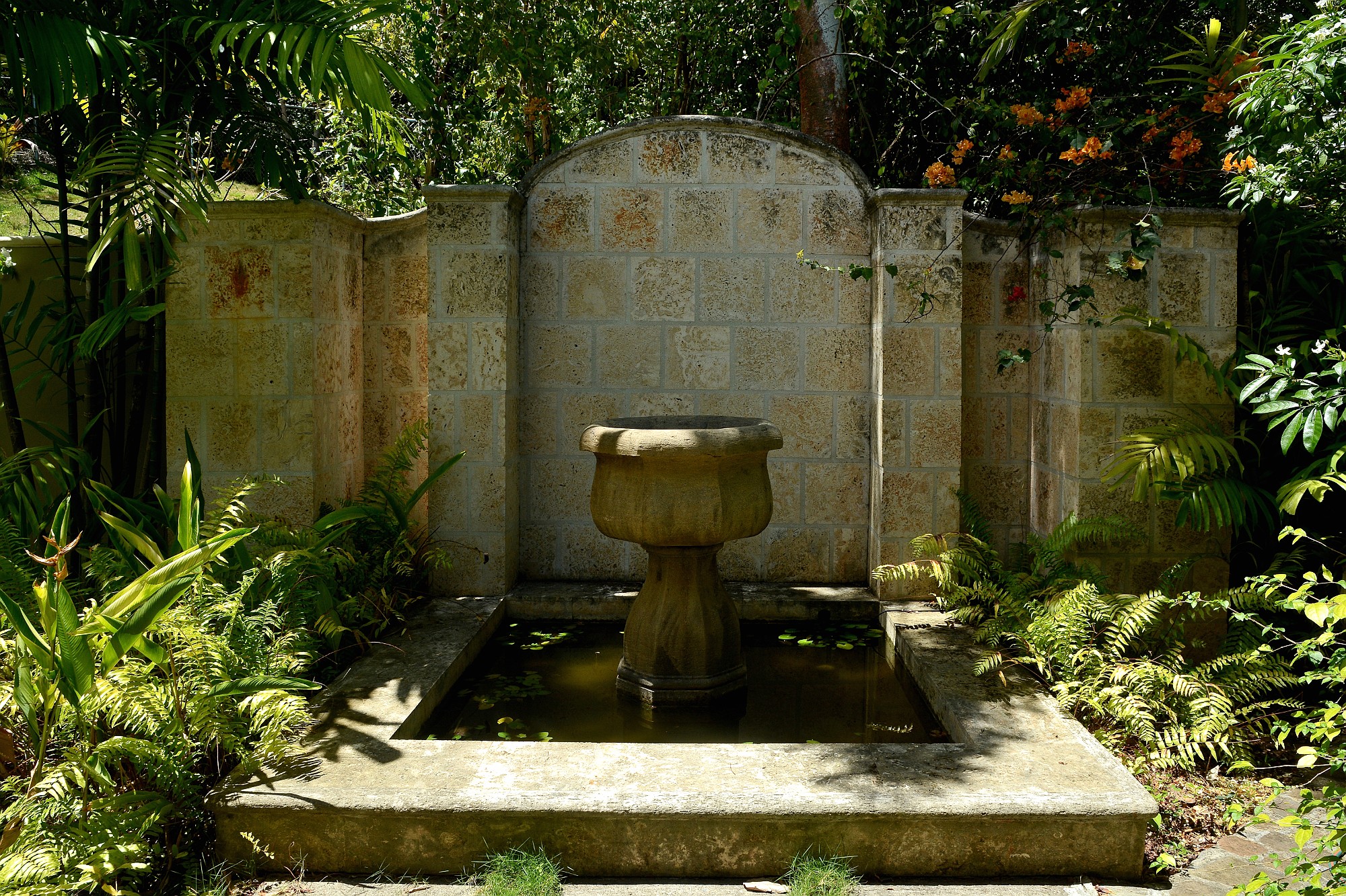 A tranquil central courtyard, planted with frangipani and ginger lilies and centred around a stone urn water feature feeding a lily pond, provides a sheltered, cooling retreat behind the house.