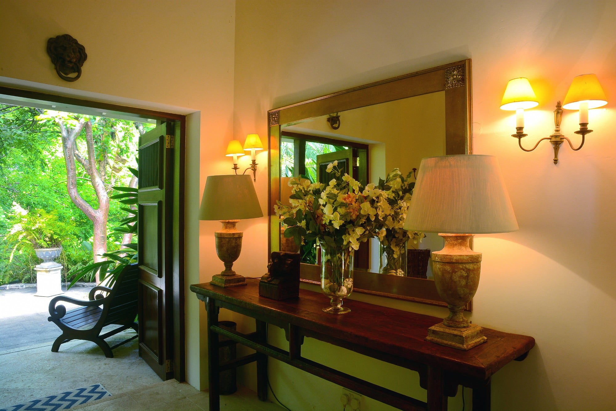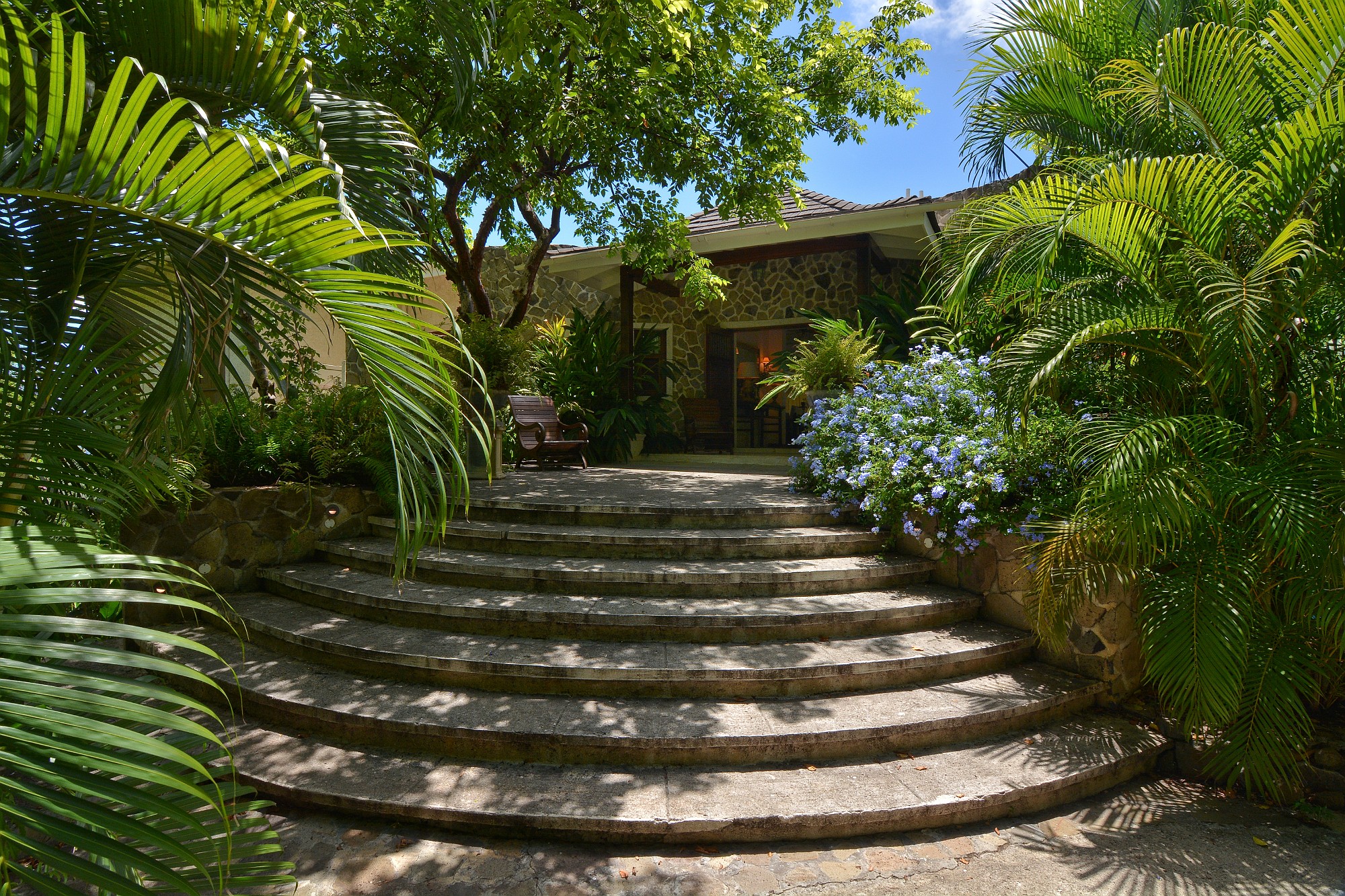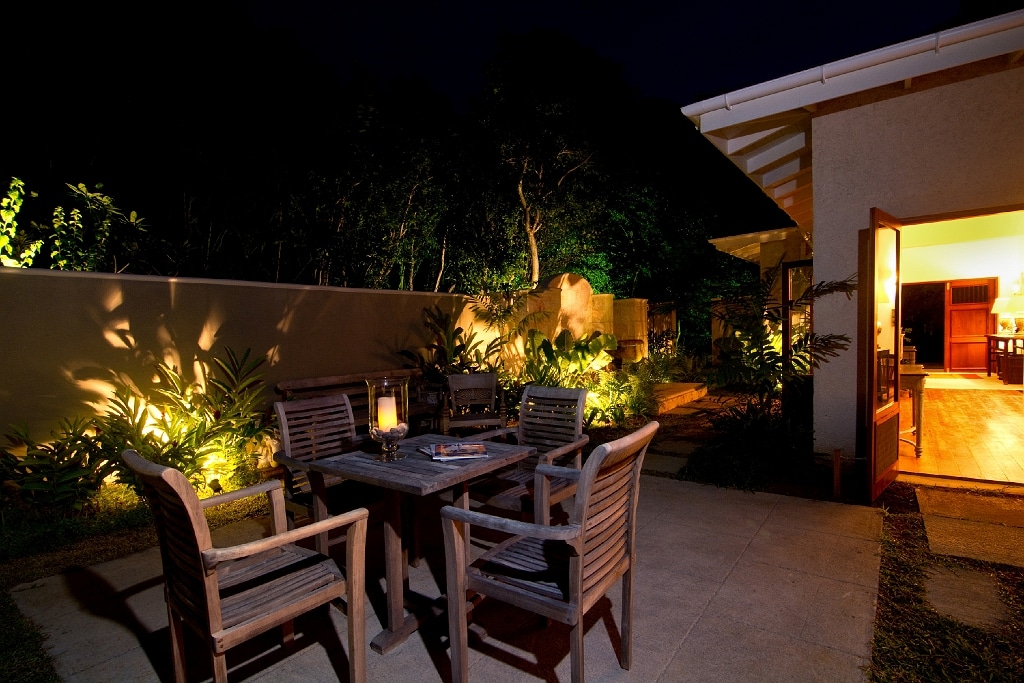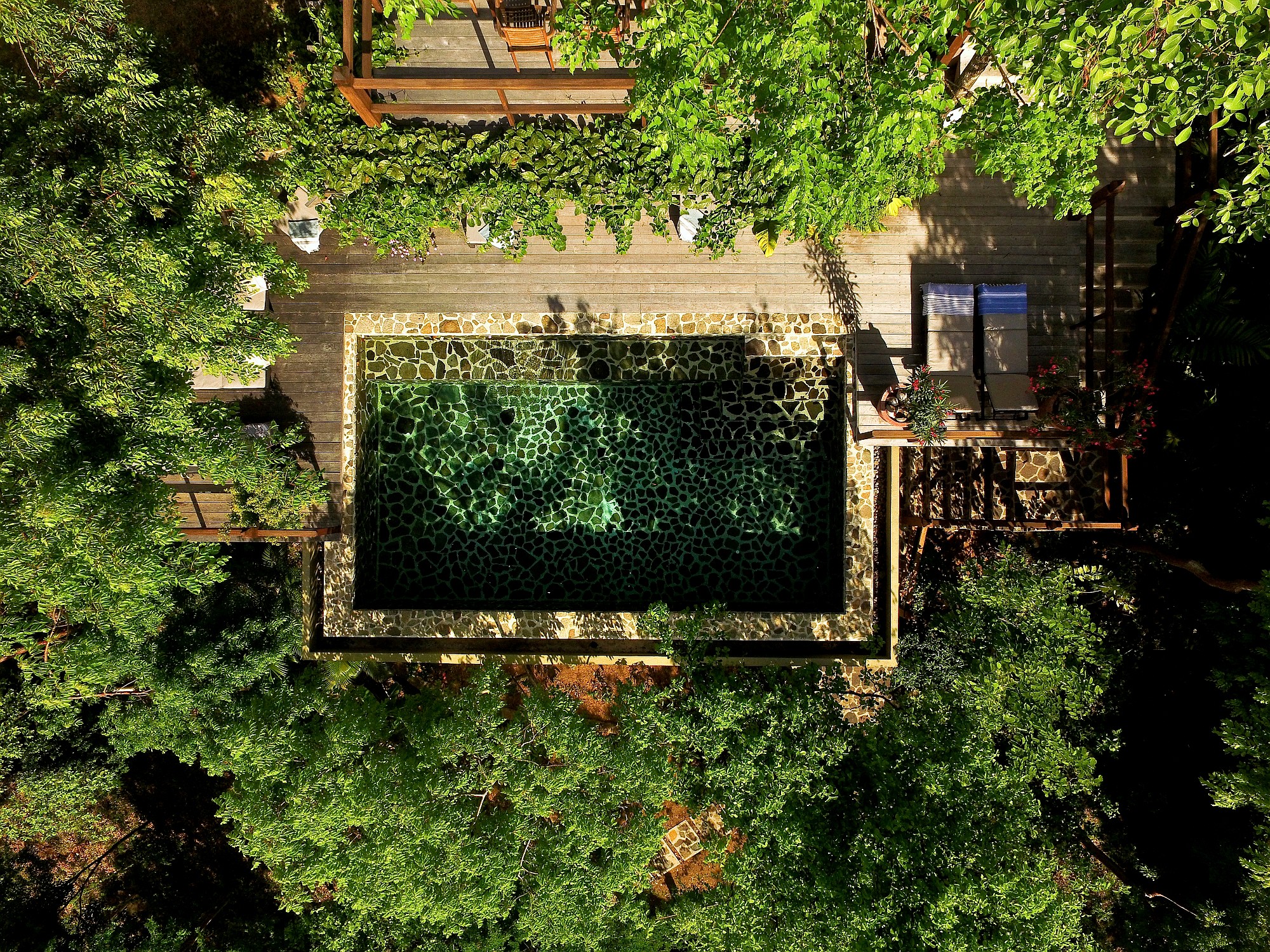 A tranquil central courtyard, planted with frangipani and ginger lilies and centred around a stone urn water feature feeding a lily pond, provides a sheltered, cooling retreat behind the house.