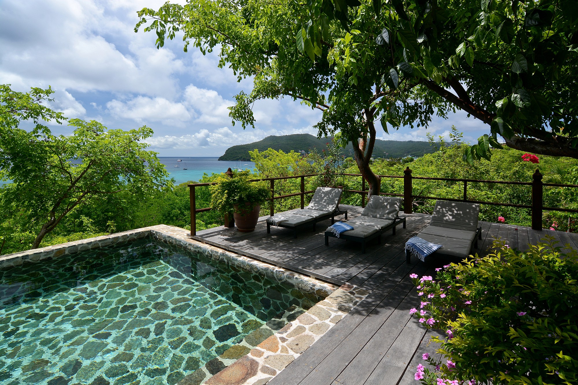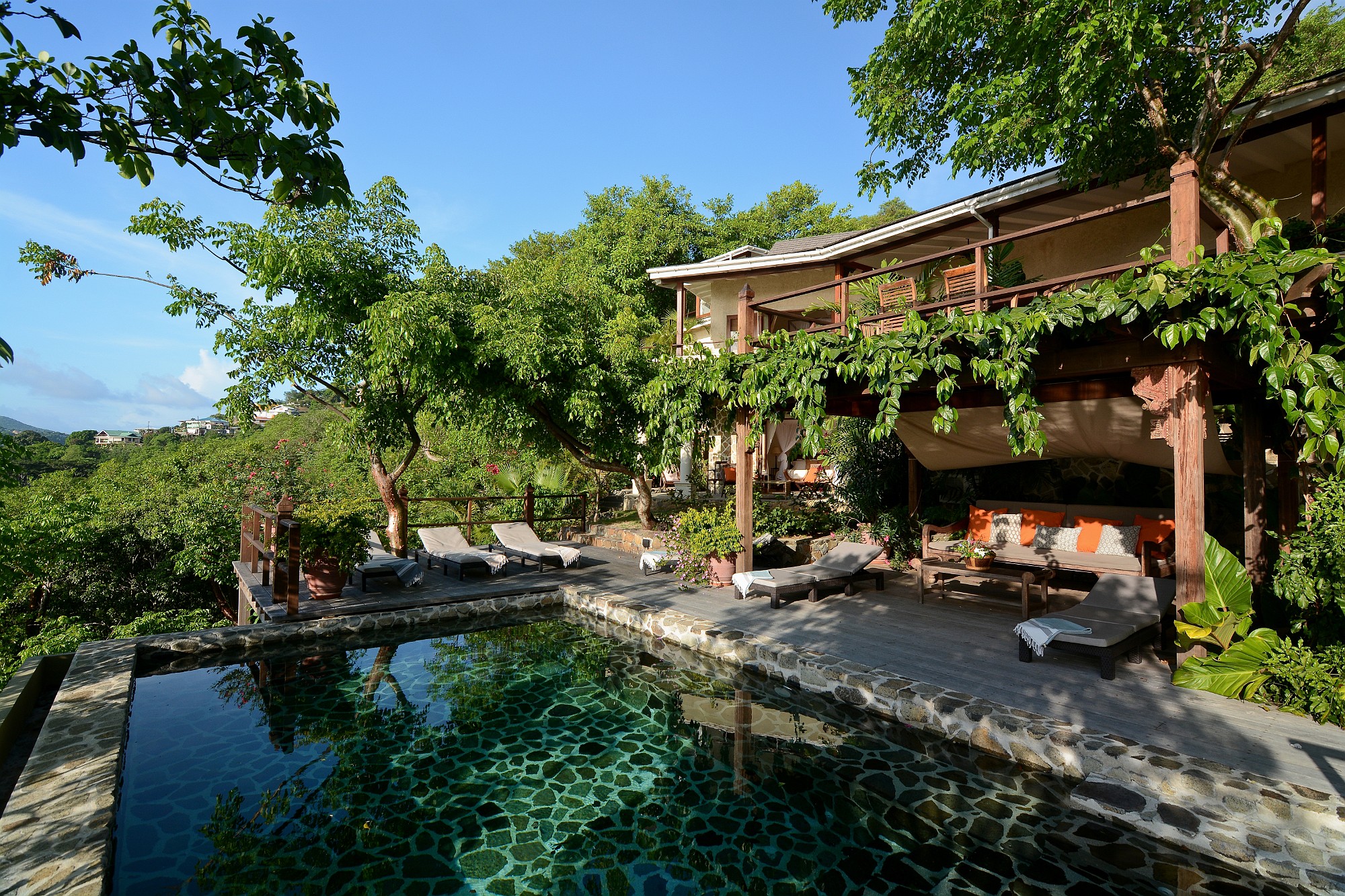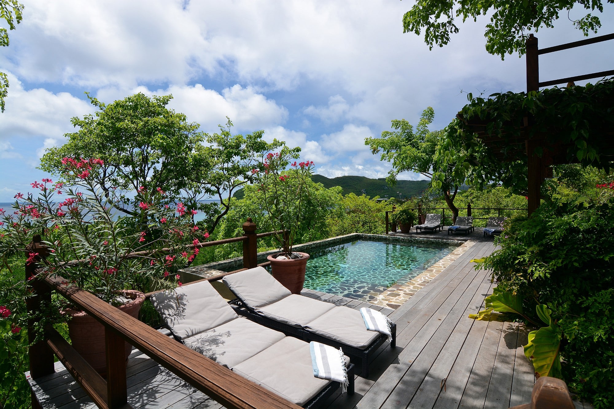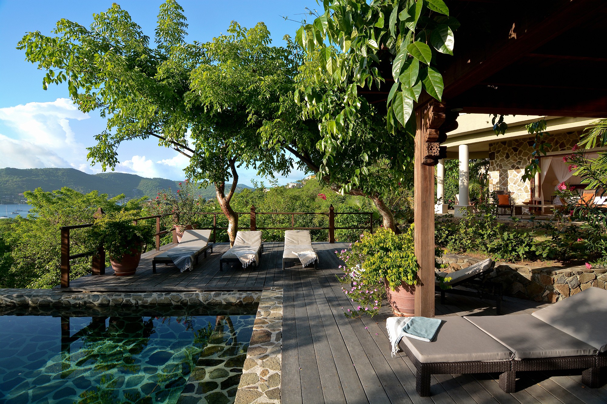 Recent enhancements include steps leading directly from the living terrace down to a private swimming pool and shaded deck area, positioned to take full advantage of the views across the bay. This addition significantly enhances the villa’s lifestyle and rental appeal, creating a complete indoor–outdoor living experience.