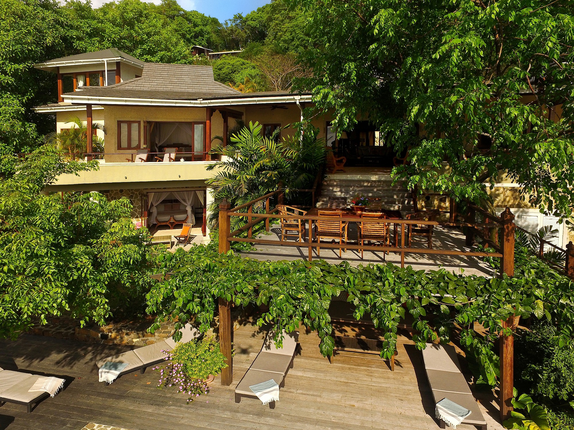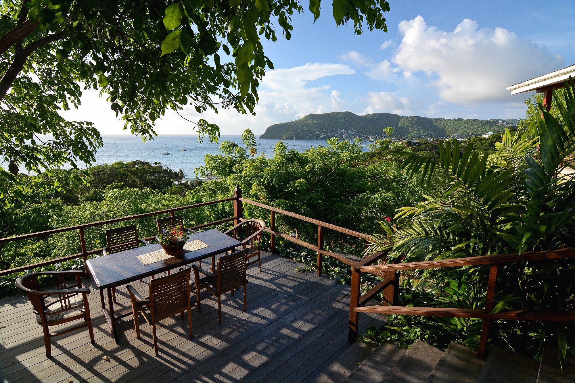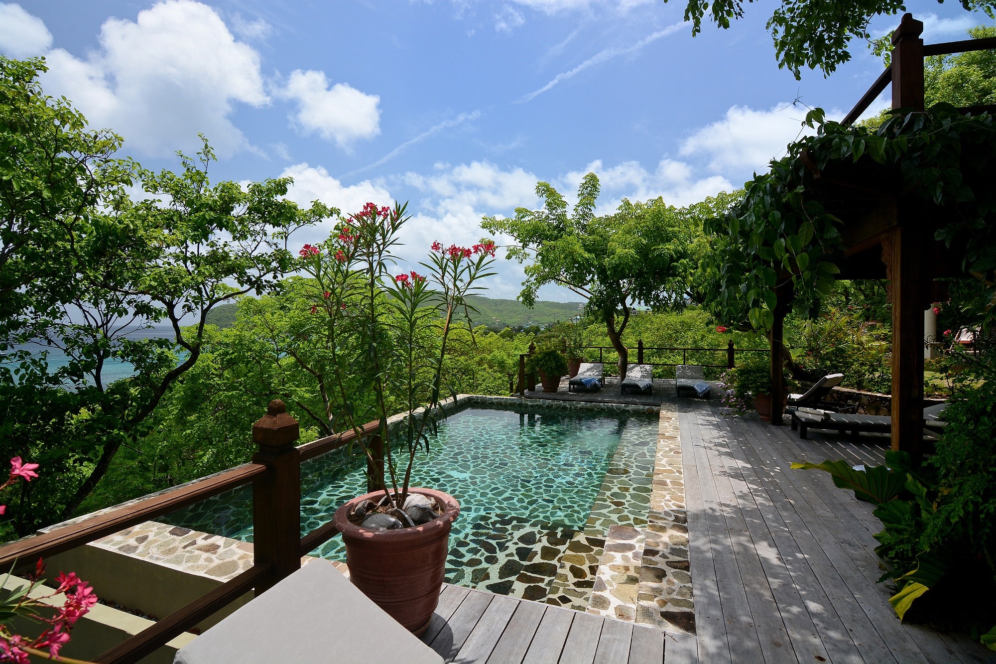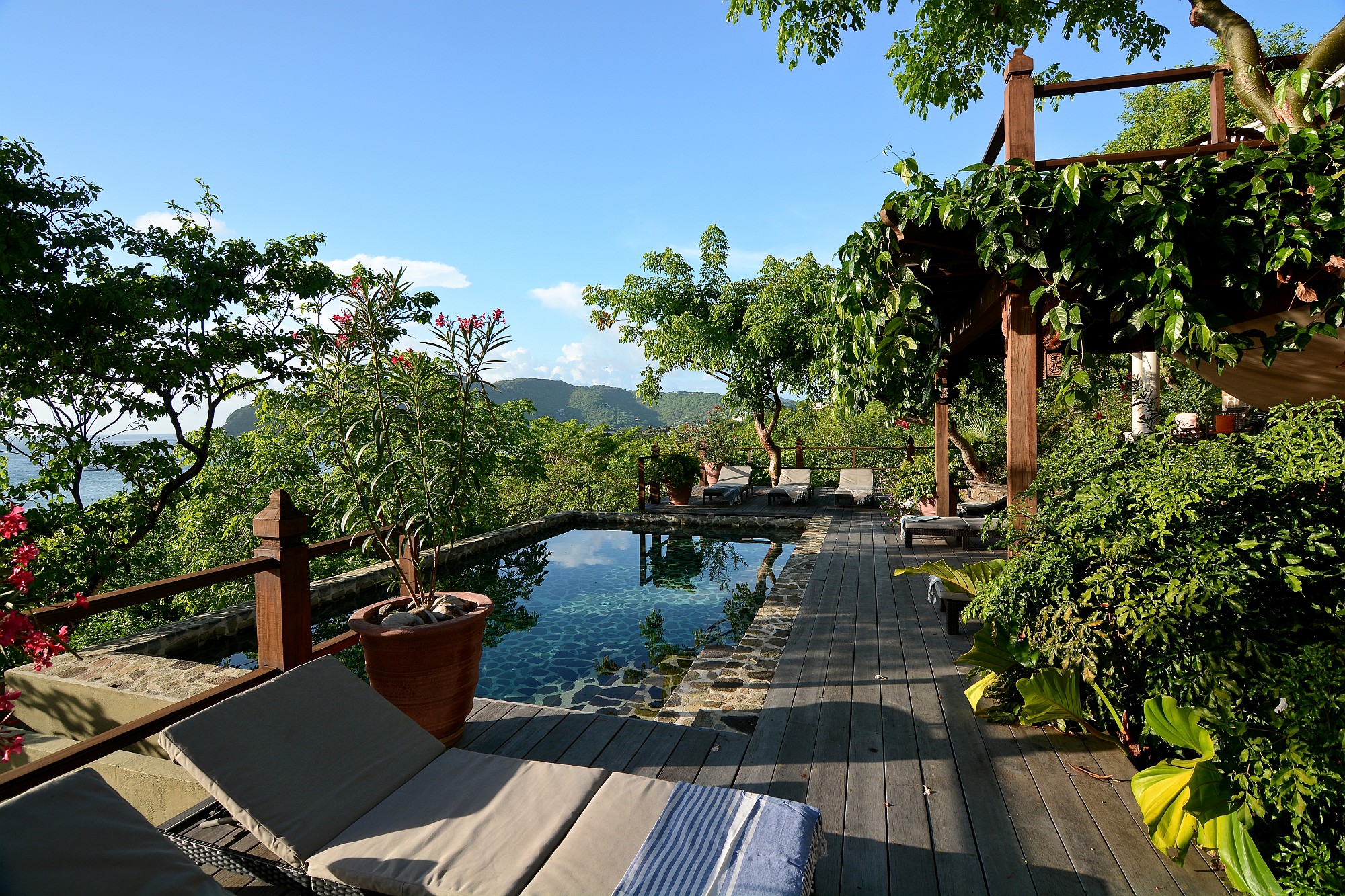 Recent enhancements include steps leading directly from the living terrace down to a private swimming pool and shaded deck area, positioned to take full advantage of the views across the bay. This addition significantly enhances the villa’s lifestyle and rental appeal, creating a complete indoor–outdoor living experience.