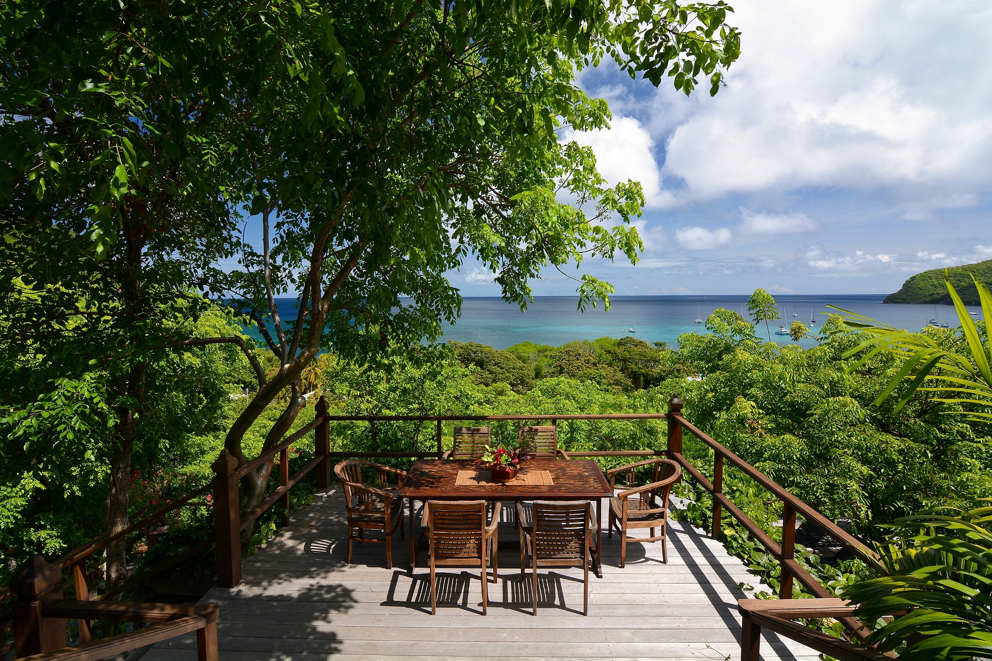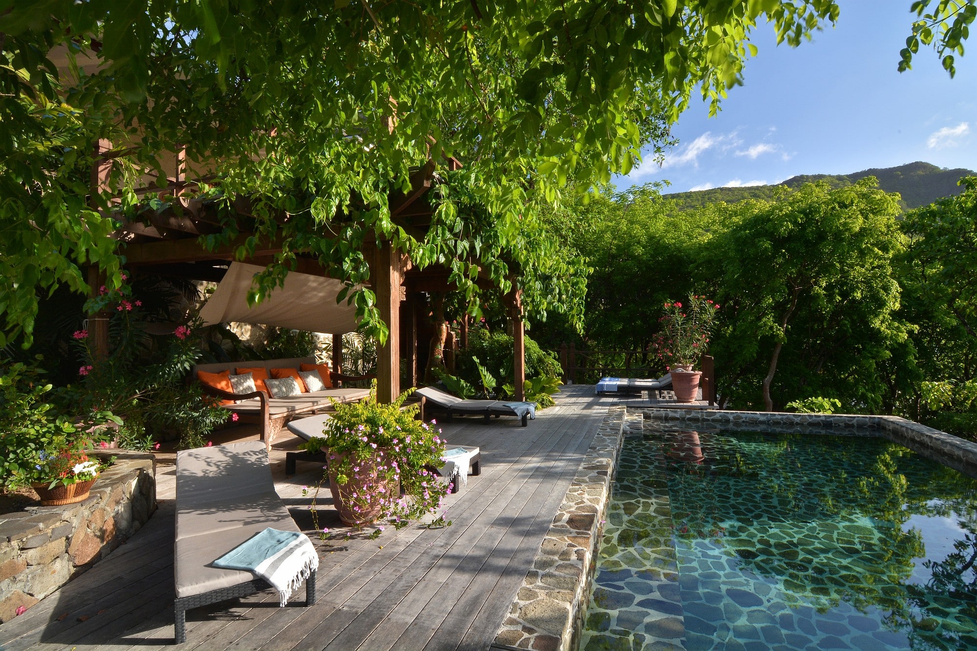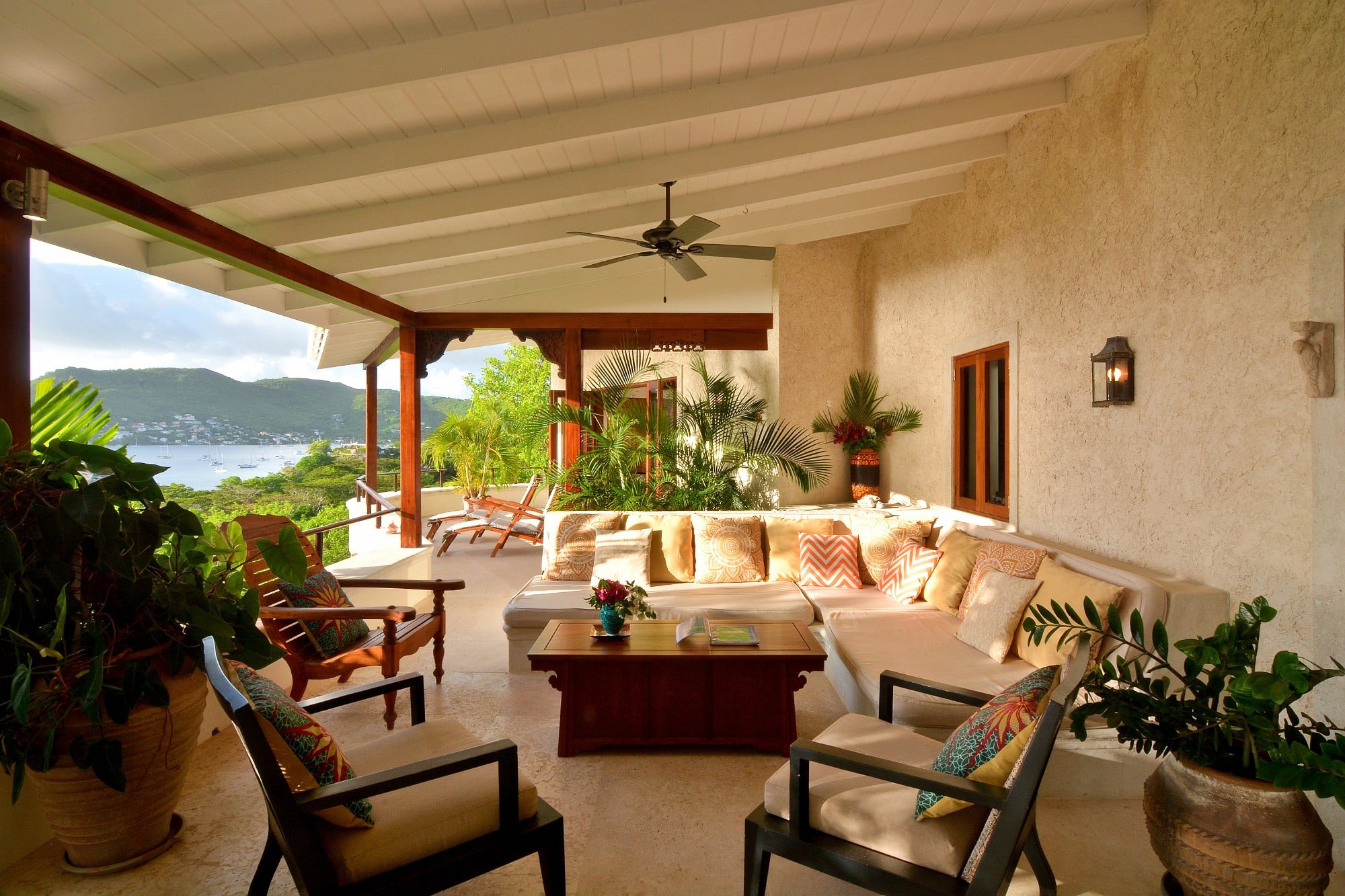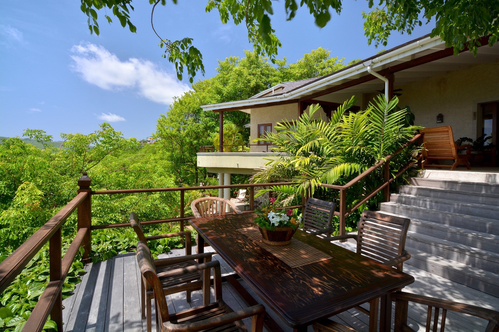 Recent enhancements include steps leading directly from the living terrace down to a private swimming pool and shaded deck area, positioned to take full advantage of the views across the bay. This addition significantly enhances the villa’s lifestyle and rental appeal, creating a complete indoor–outdoor living experience.
