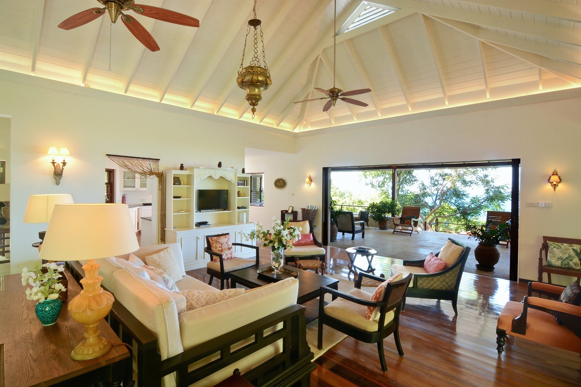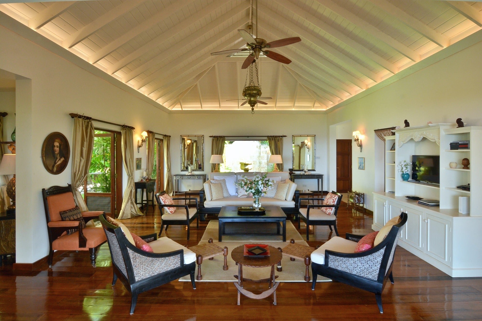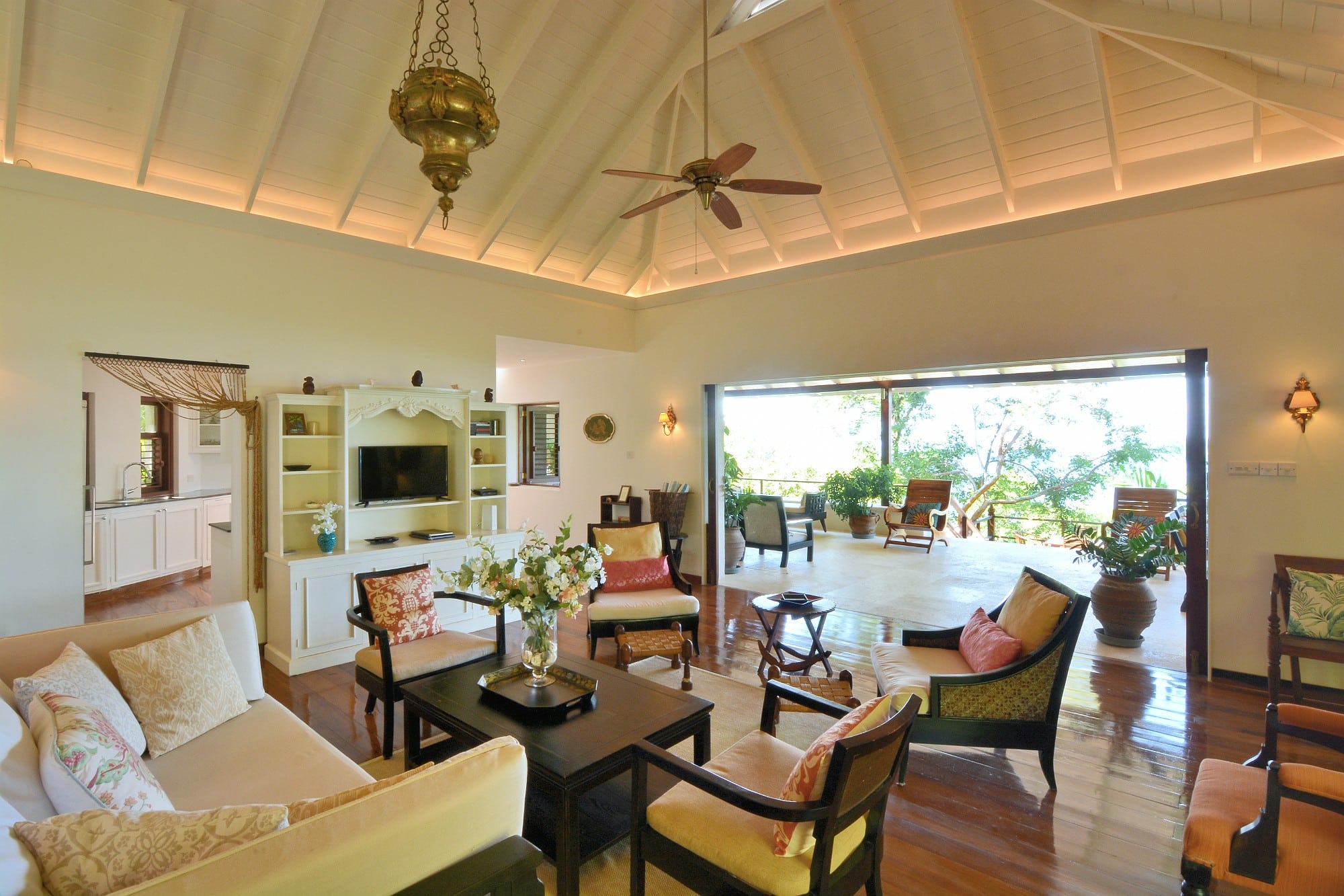 Cassava was designed by a renowned architect with a distinguished body of work in Mustique. The villa has been conceived to embrace its setting, with expansive terraces, large sliding doors, and a layout that flows effortlessly between interior and exterior spaces. The main living level opens onto a wide, ocean-facing terrace overlooking the pool and gardens below—an ideal setting for entertaining or quiet relaxation.