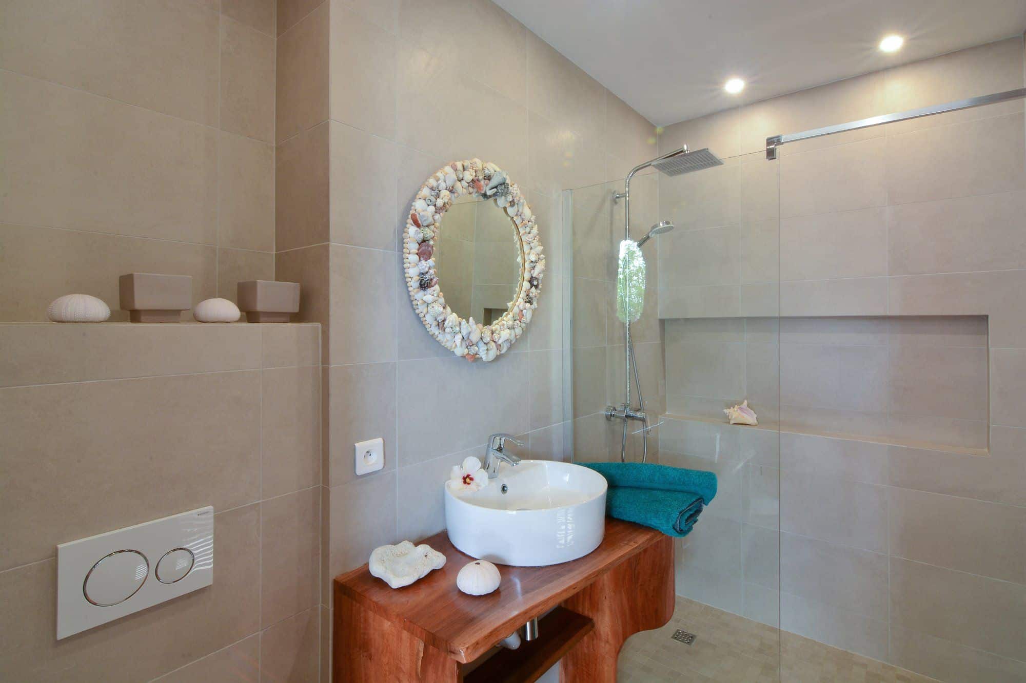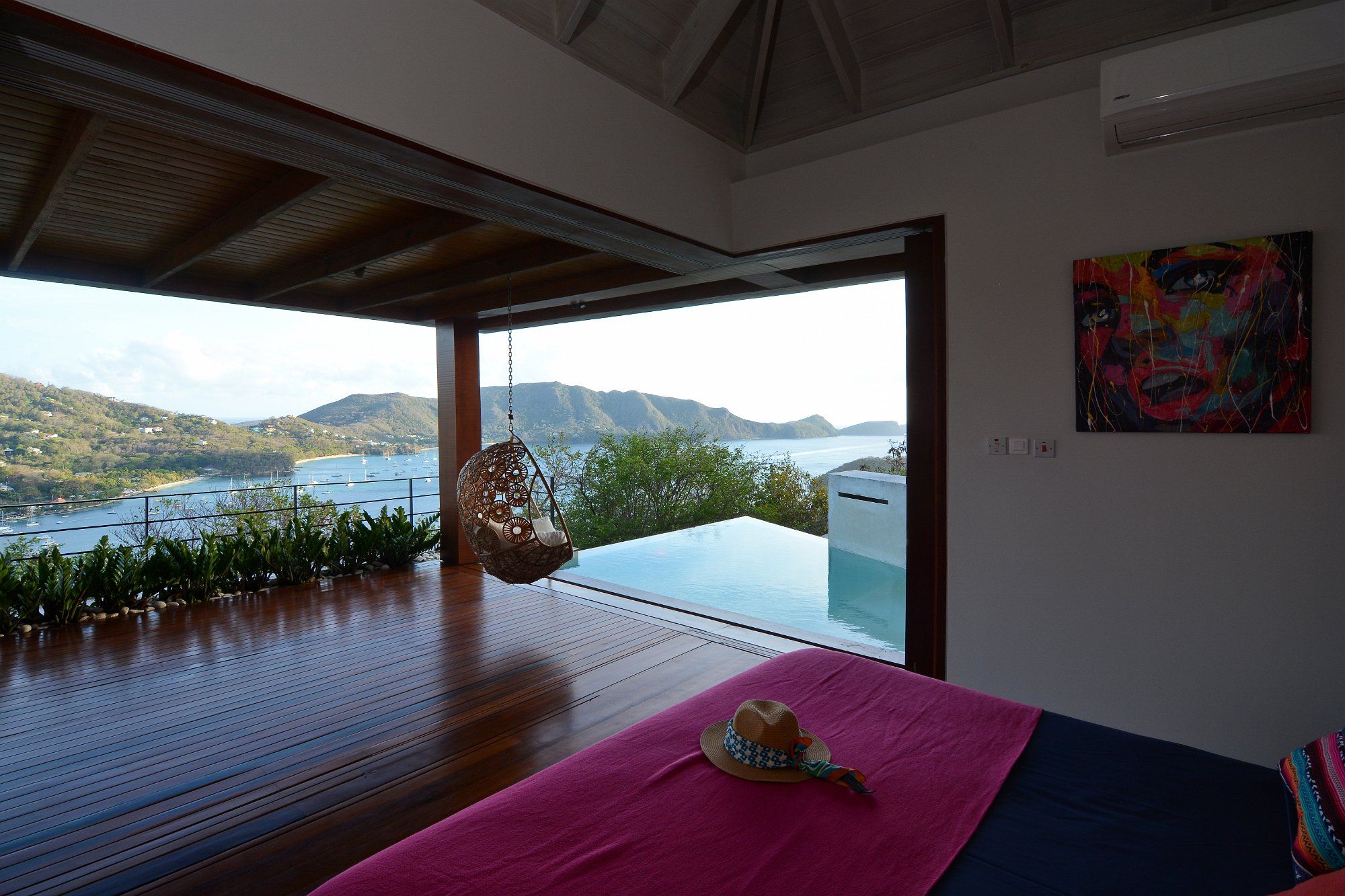 Relax on the expansive shady deck and take in the fabulous panoramic vista, stretching right over Admiralty Bay across to the famous white-sand beaches and the tip of West Cay. The sunsets from the villa are magical, so sip on your cocktail in the private infinity pool – you have found a magical spot! Take 2 or 3 steps up to a private tropical garden area from here. A lovely, serene reading/chill-out area is...