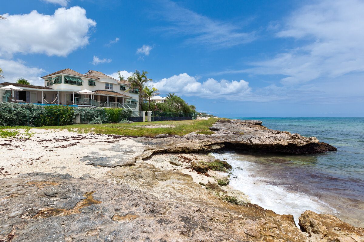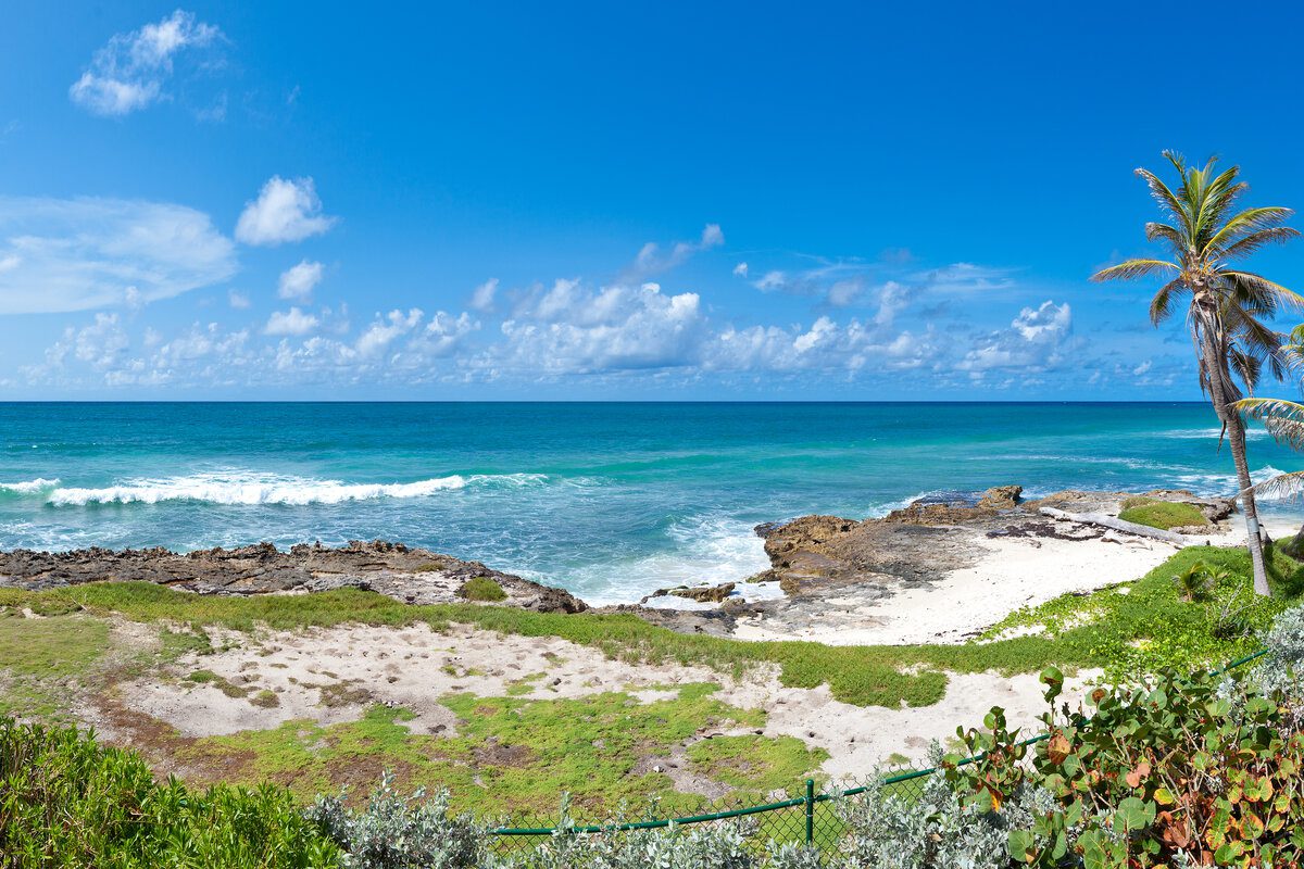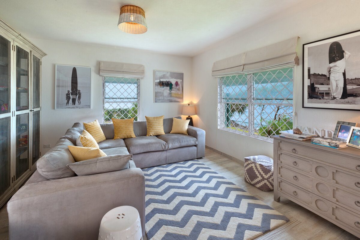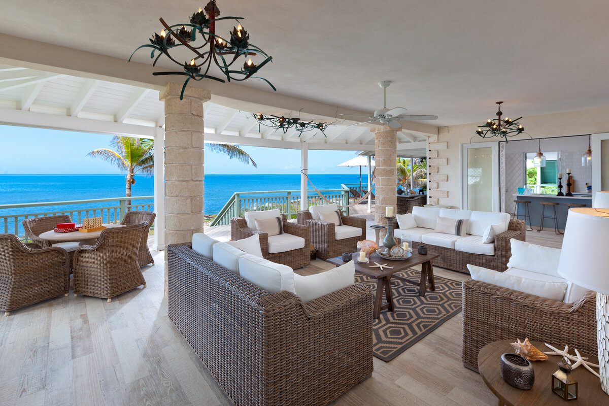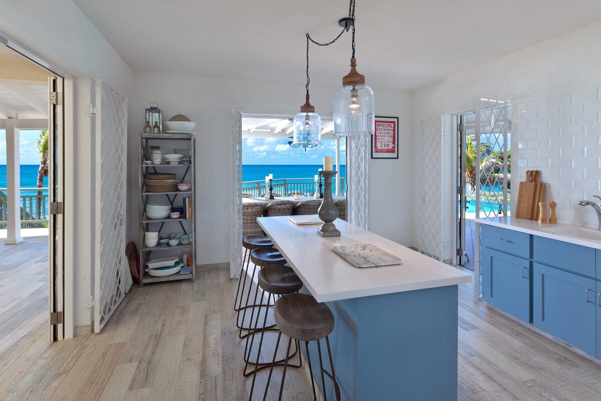 This stunning oceanfront villa overlooks the Atlantic Ocean on the Southern tip of Barbados and features a breezy open-plan design, retro beachy vibe, and views. The home has been recently refurbished with light wooden floors, eye-catching chandeliers, and an upgraded state-of-the-art kitchen.