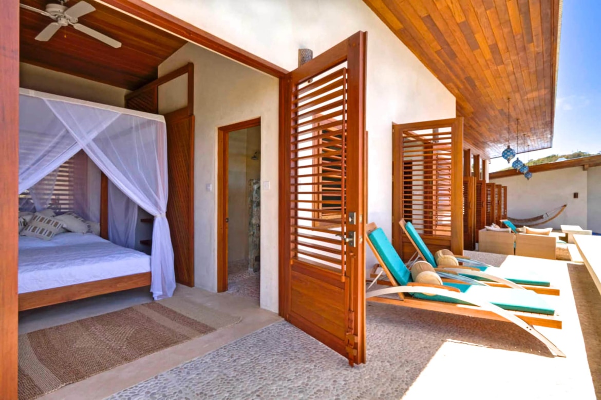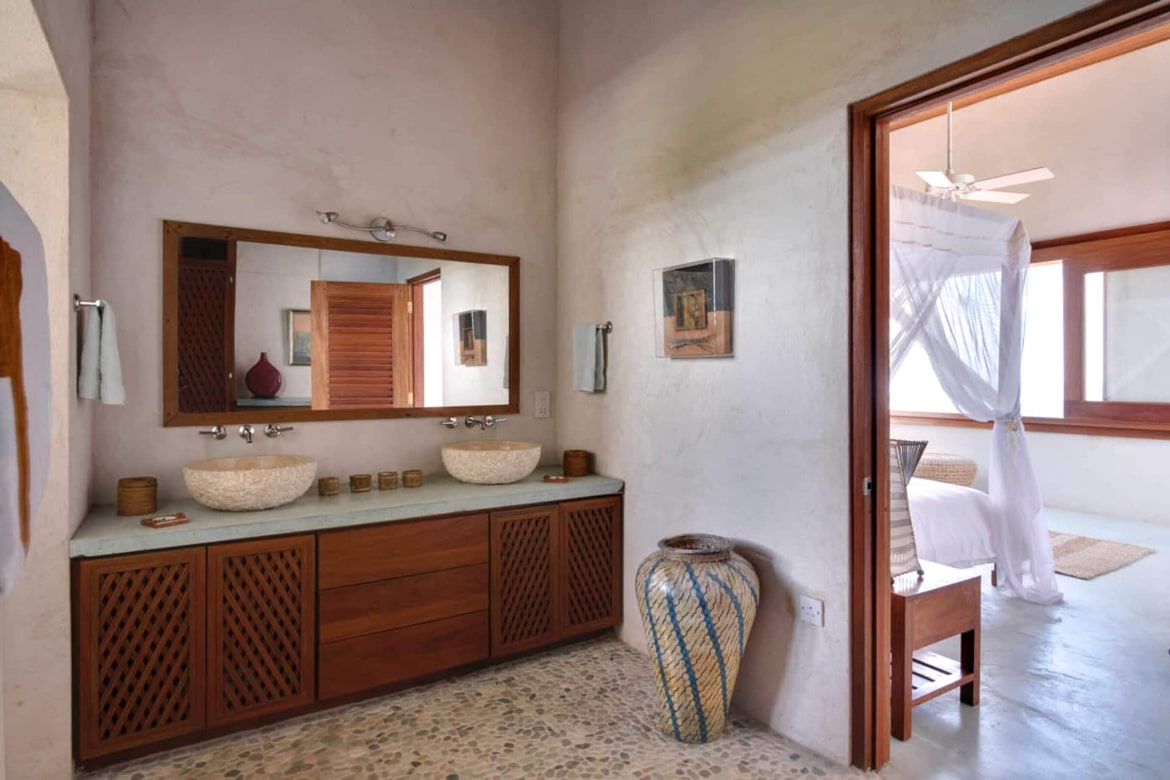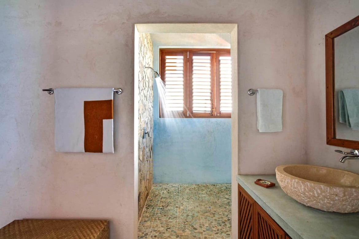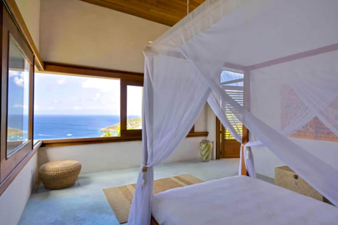 With its vast panoramic corner window, the primary bedroom suite has a terrace overlooking the entire bay. A large en-suite bathroom has a stone wall shower overlooking Mustique and a full dressing room with a private refrigerator, dresser, and ample closet space. The other two bedrooms, equipped with queen-sized beds, also enjoy a private terrace with sweeping views of Admiralty Bay and private bathrooms with high-end faucets and hand-carved marble sinks. The house benefits from the natural cooling breeze, and there are fans for those who need something extra.
