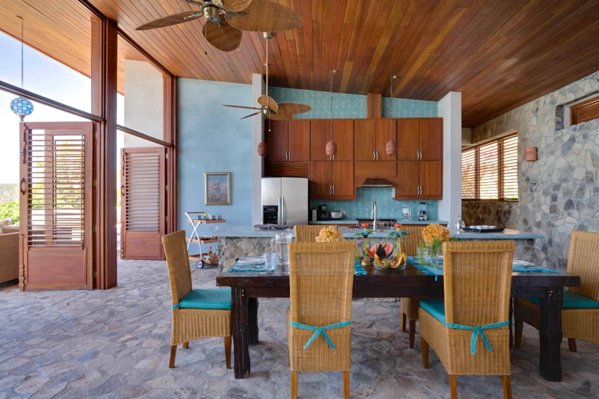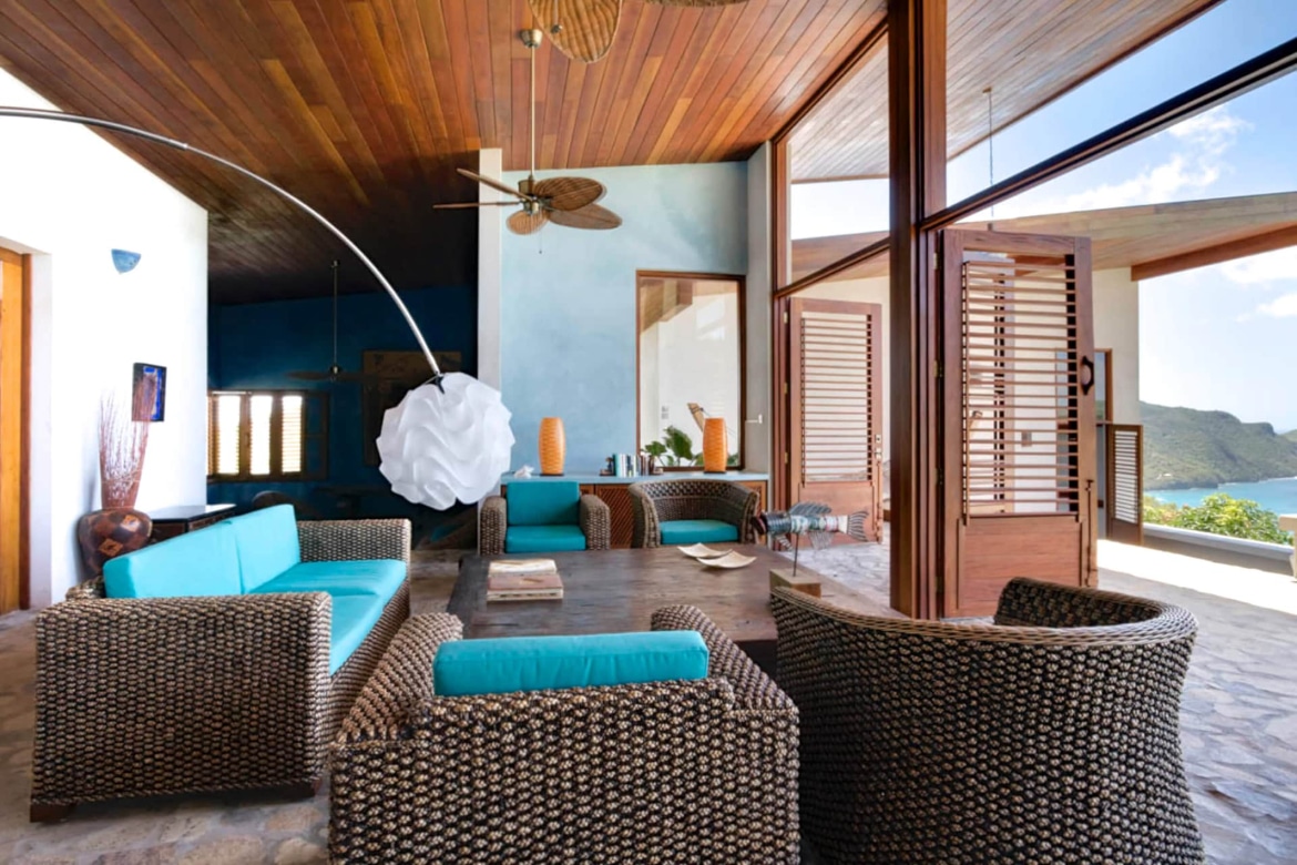 The villa features a unique and grand corner primary bedroom window and high ceilings constructed from natural materials sourced locally. It can comfortably sleep six people. Glass tiles and pigmented cement countertops feature accented tropical wood, stones, and pebbles. Letovah has a Balinese theme; this property exudes laid-back luxury. The spacious living and dining room has a fully equipped open kitchen with magnificent views encompassing the entire span of Admiralty Bay, including Princess Margaret and Lower Bay beaches, the two best swimming beaches on the island. In the cool office/snug area off the main lounge is a 42-inch flat-screen TV, a perfect playroom for children.
