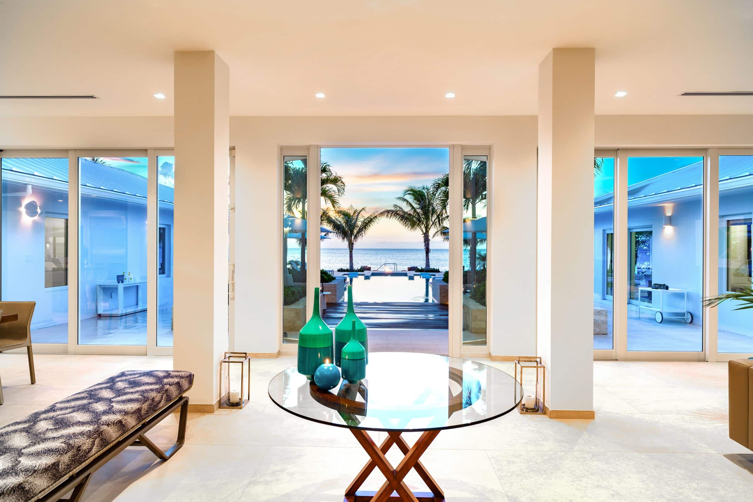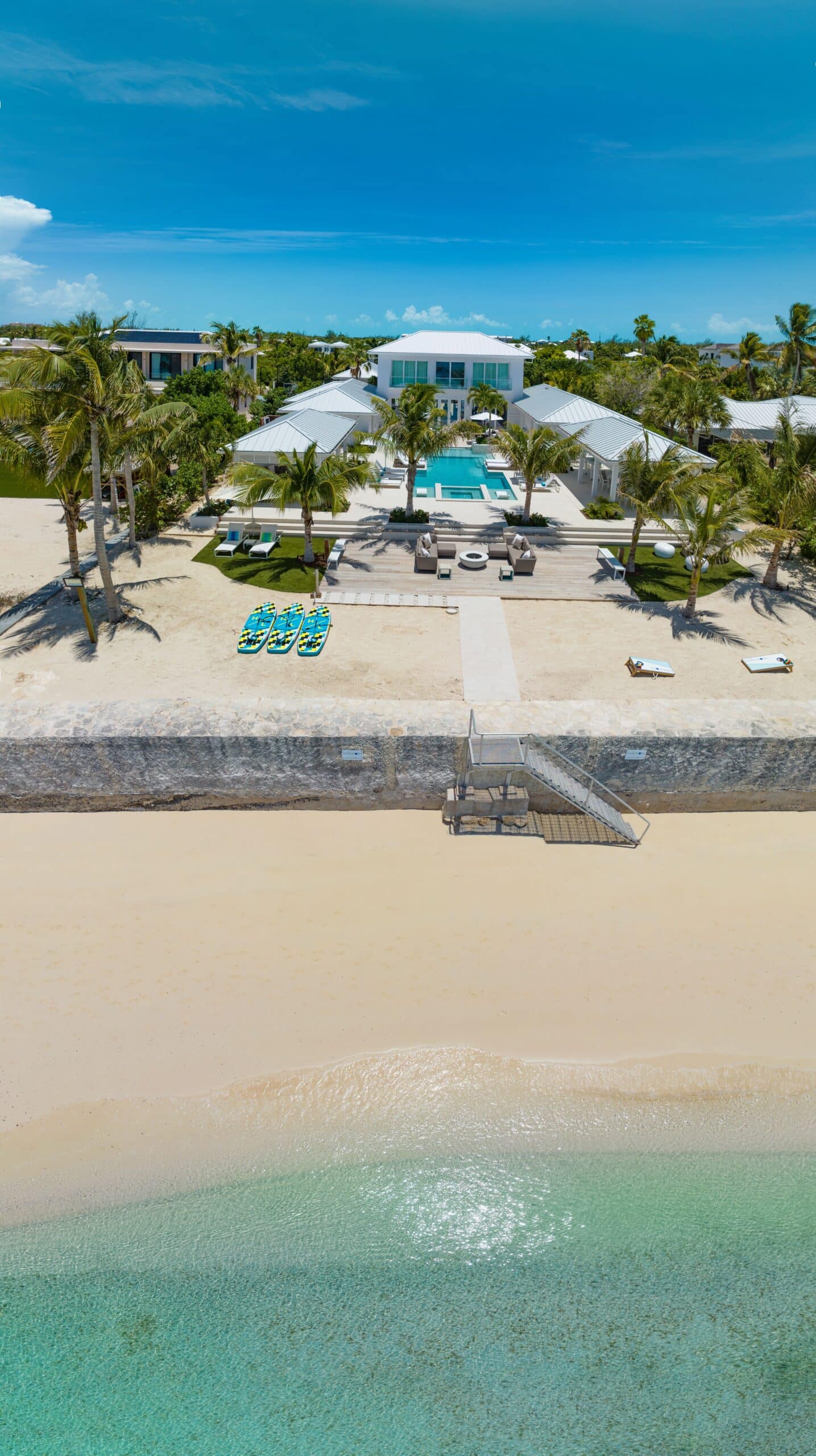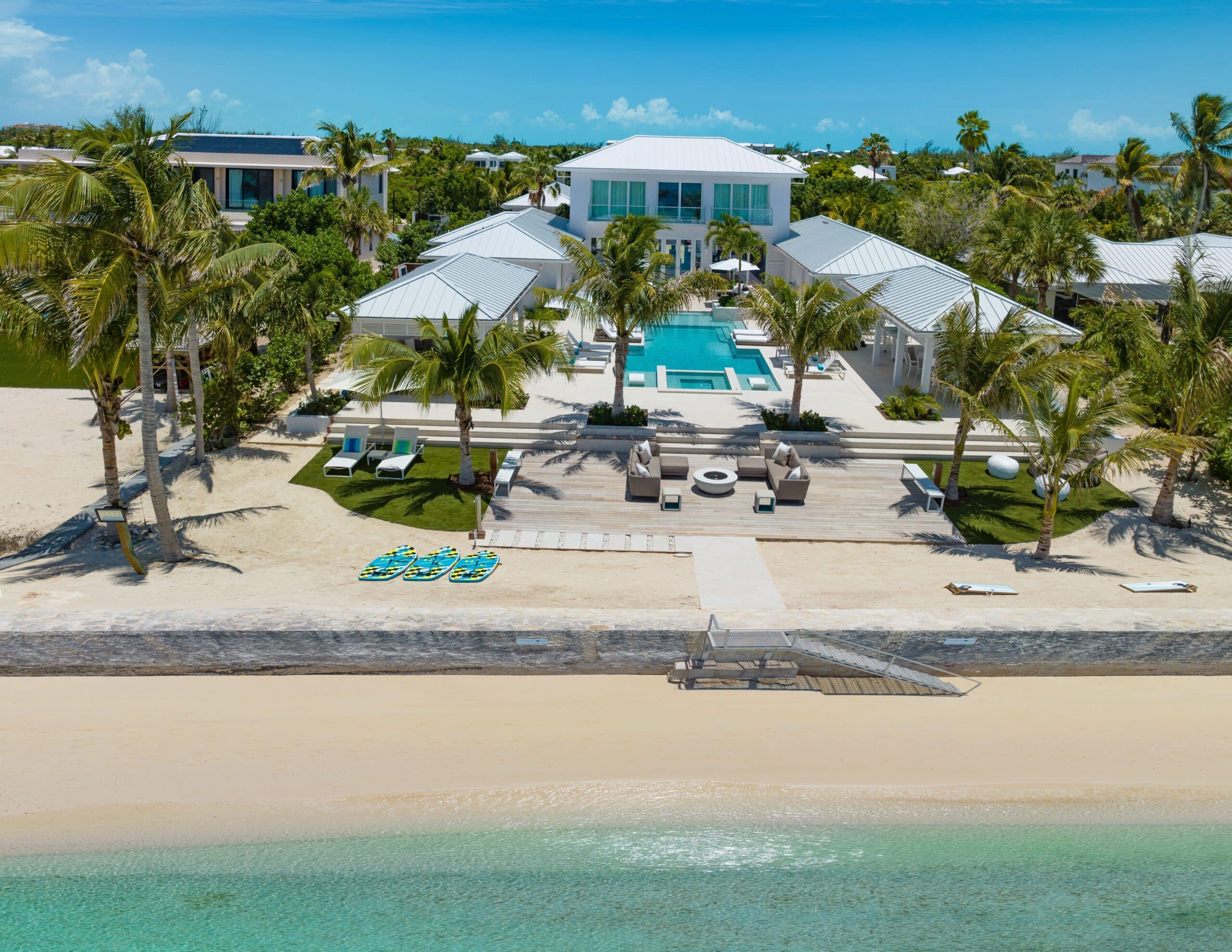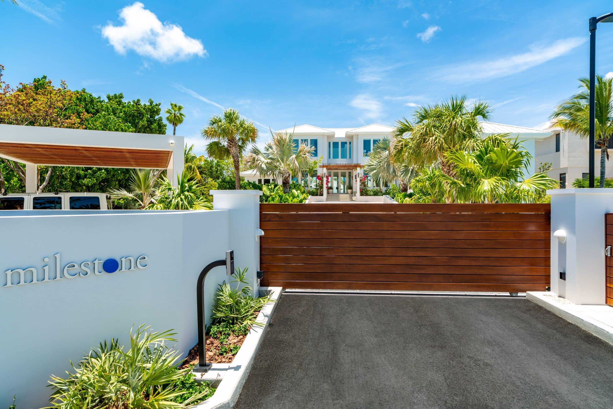 Milestone sits on the Grace Bay coastline of Providenciales, with direct beach access and unobscured views of the ocean from almost every point on the property. The gated, landscaped grounds — lit at night, including along the beach itself — create a sense of seclusion and arrival that larger resort properties simply cannot replicate. Grace Bay’s best dining, watersports, and amenities are a short drive away, but the estate is complete enough that leaving is rarely a priority.
