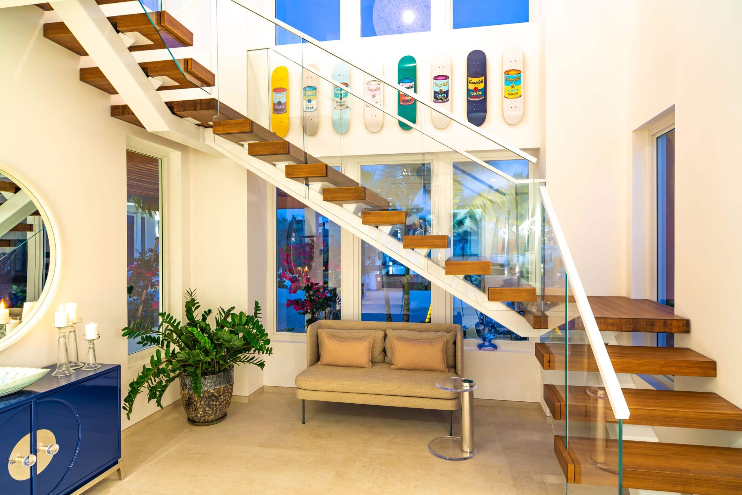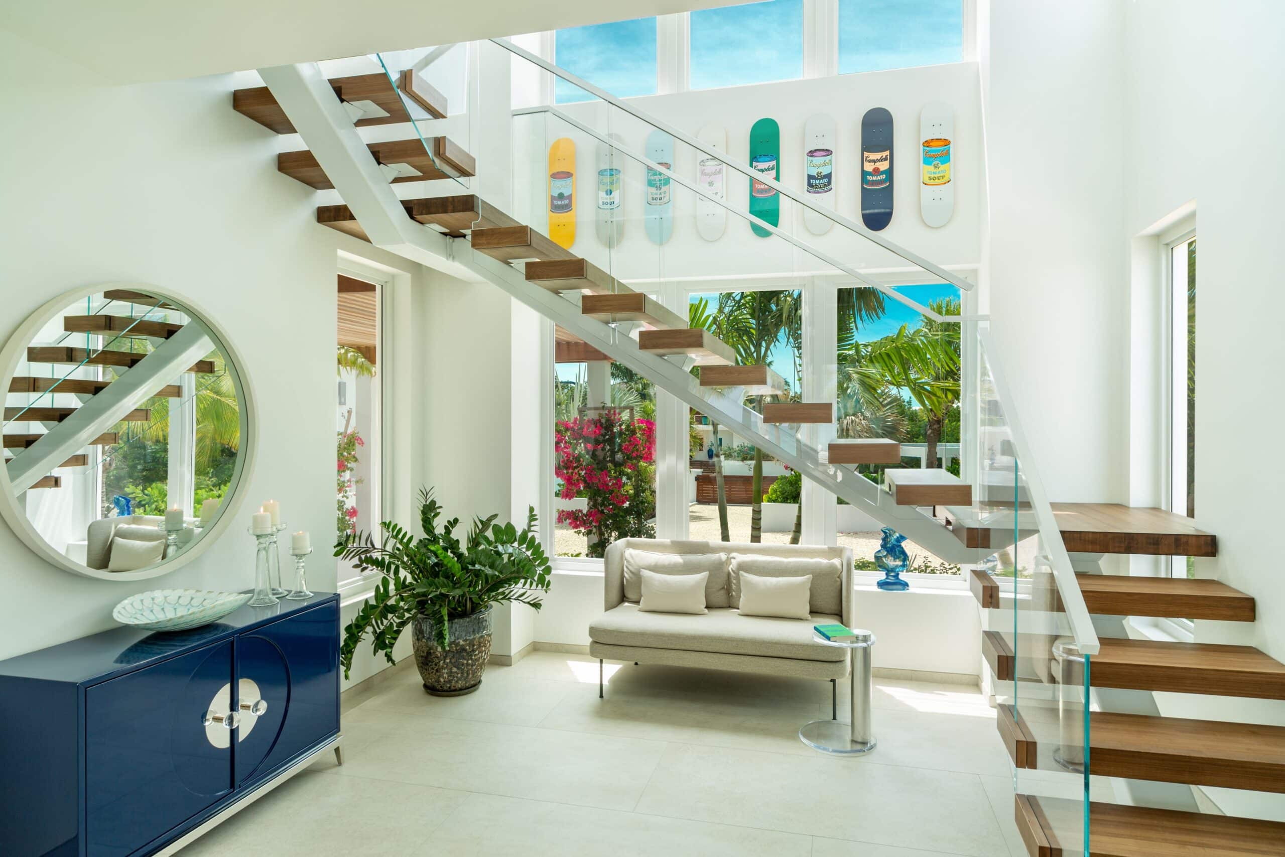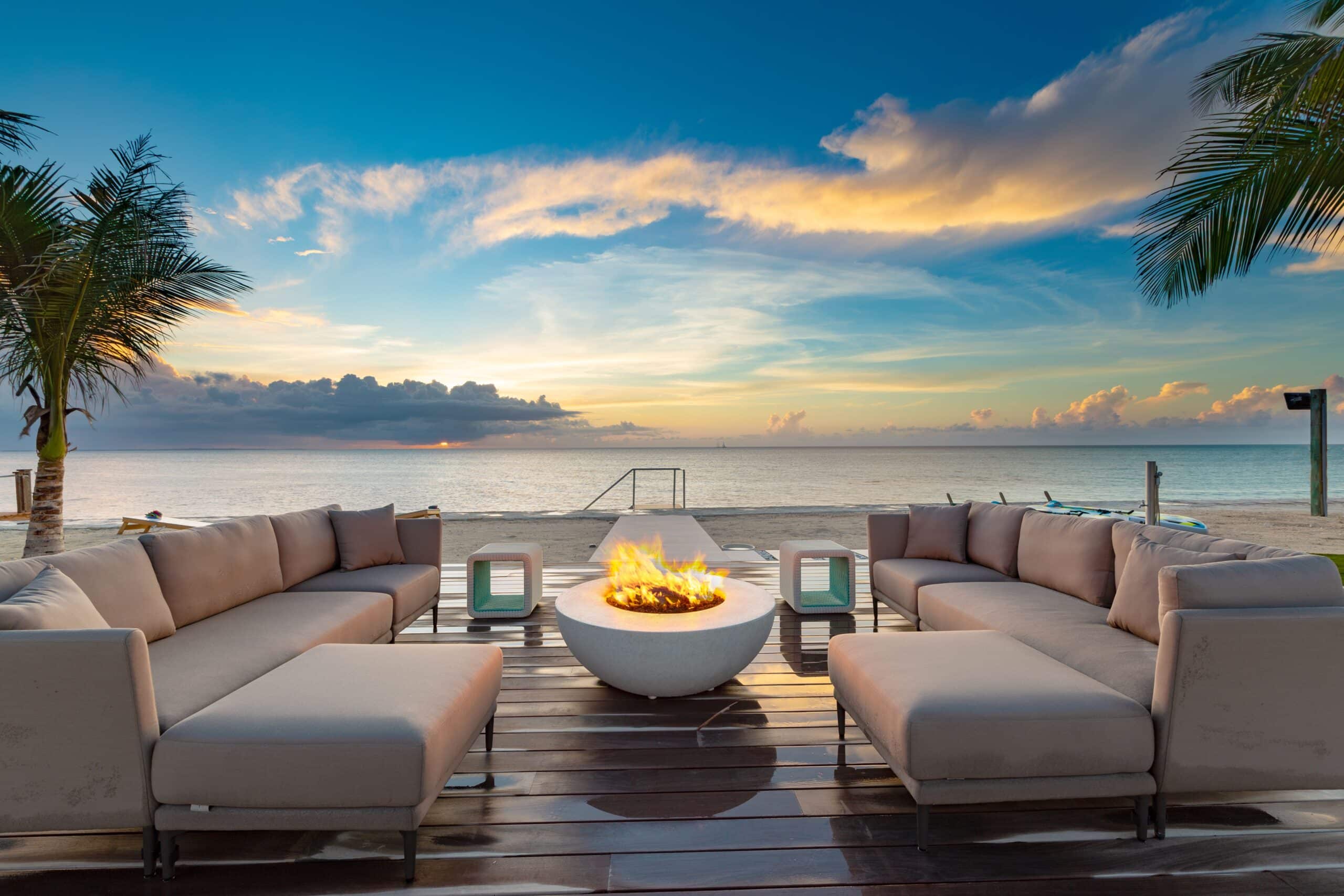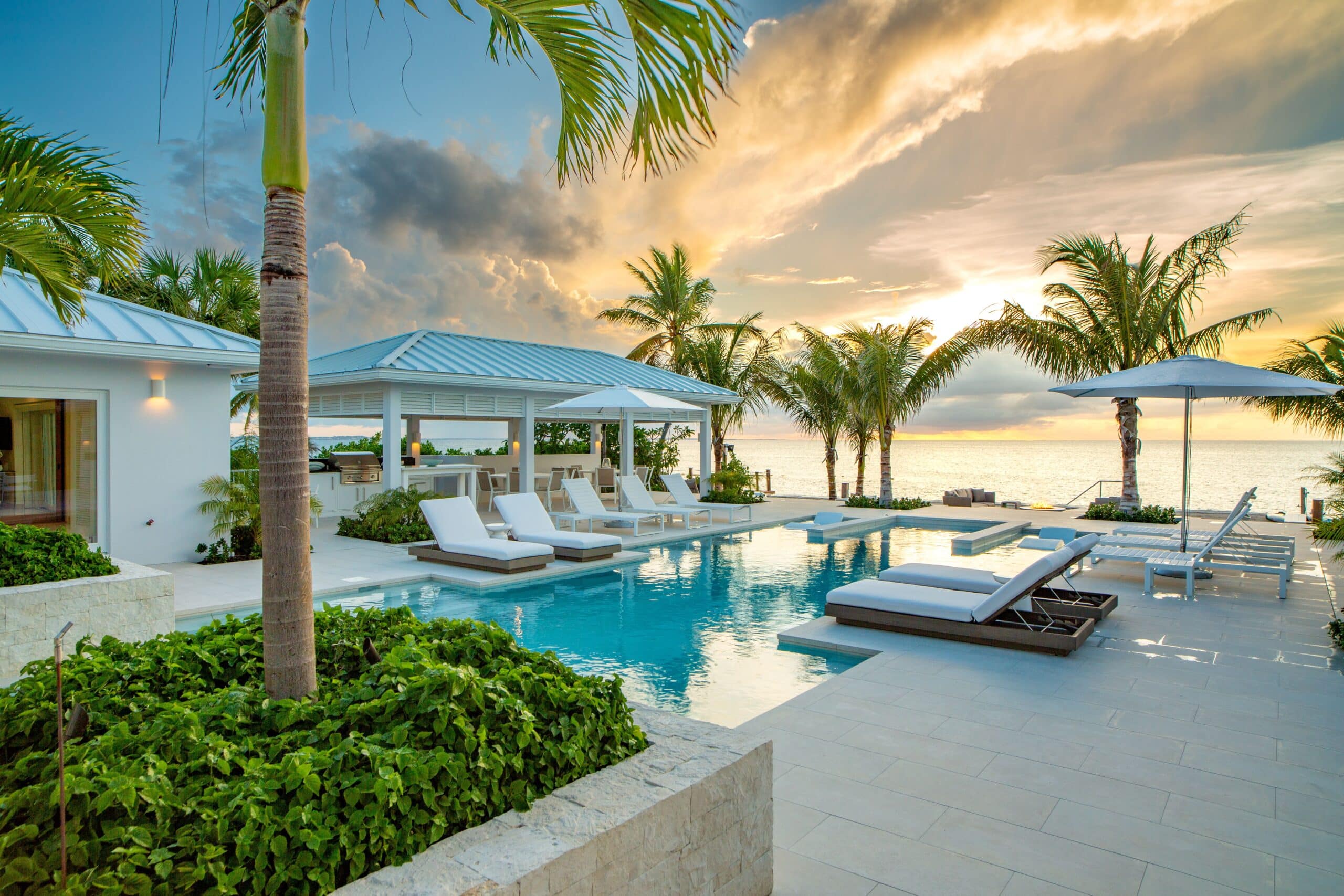 Milestone sits on the Grace Bay coastline of Providenciales, with direct beach access and unobscured views of the ocean from almost every point on the property. The gated, landscaped grounds — lit at night, including along the beach itself — create a sense of seclusion and arrival that larger resort properties simply cannot replicate. Grace Bay’s best dining, watersports, and amenities are a short drive away, but the estate is complete enough that leaving is rarely a priority.