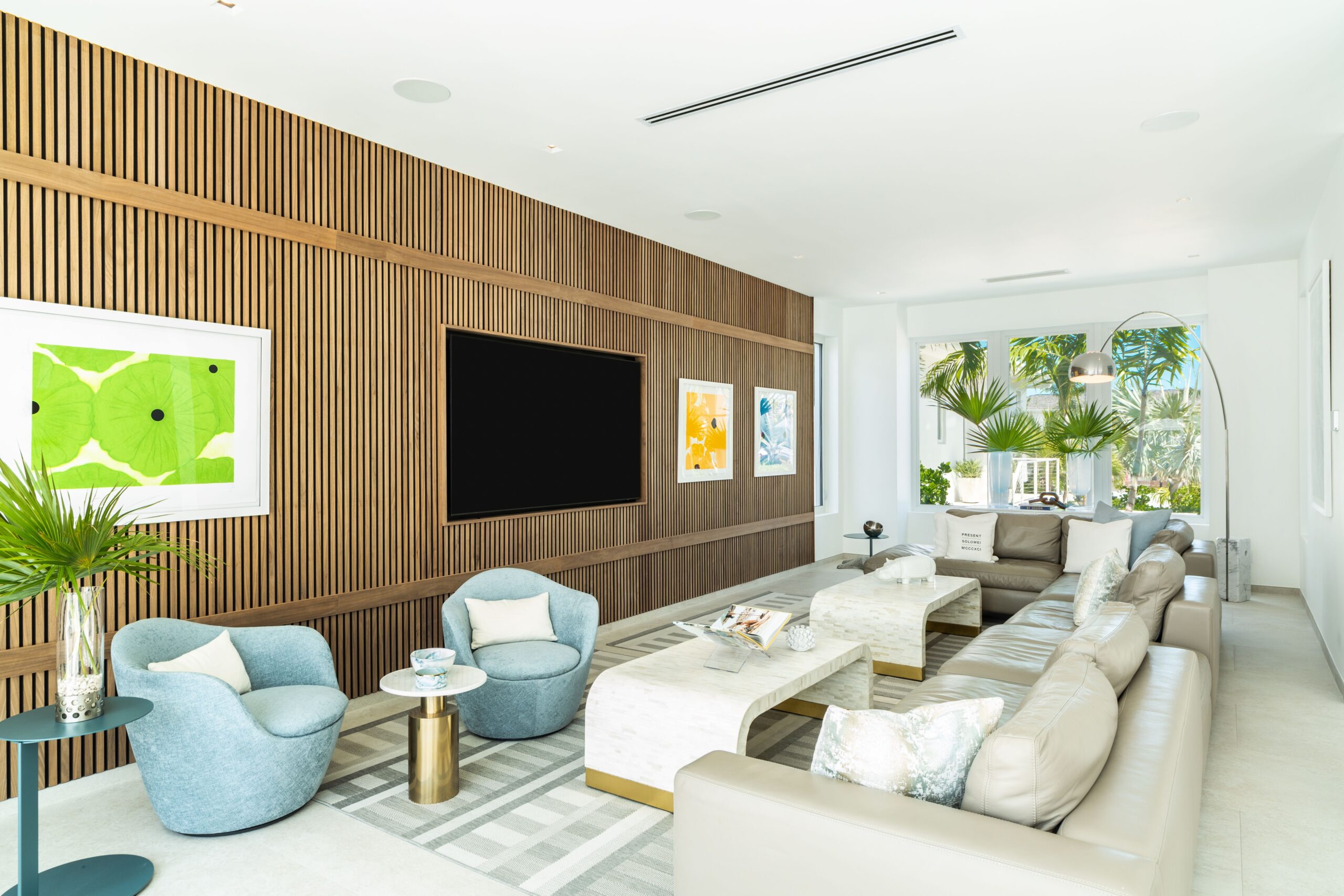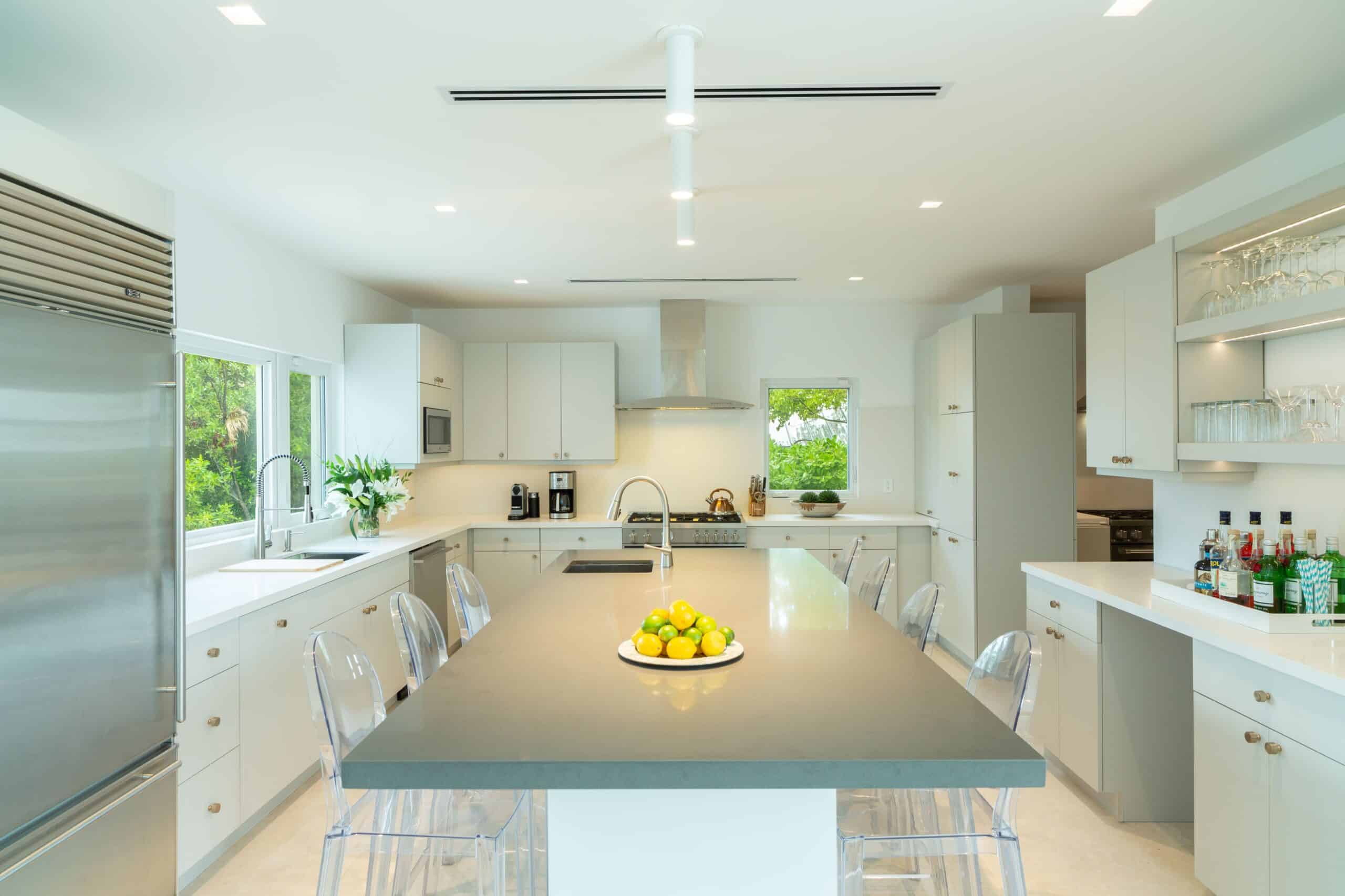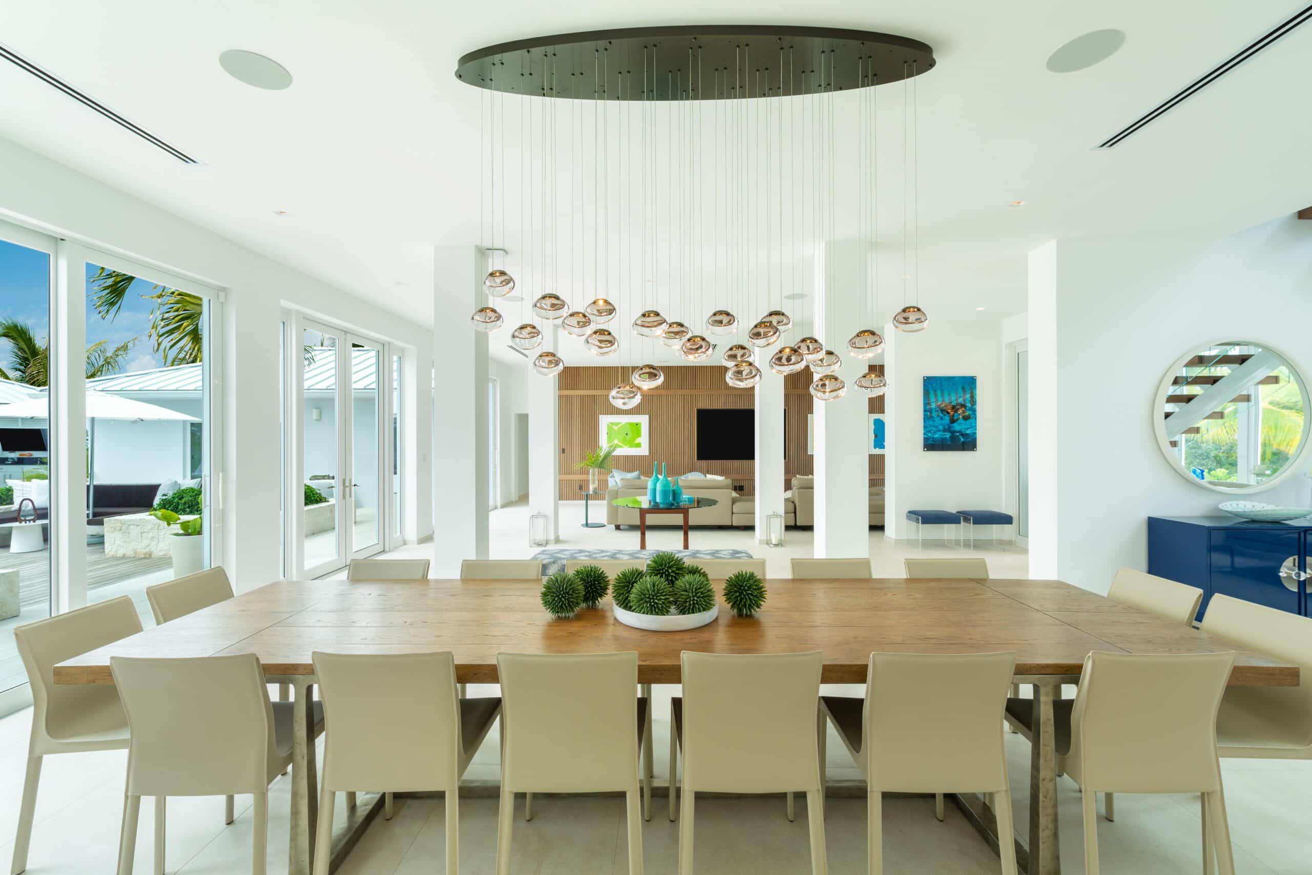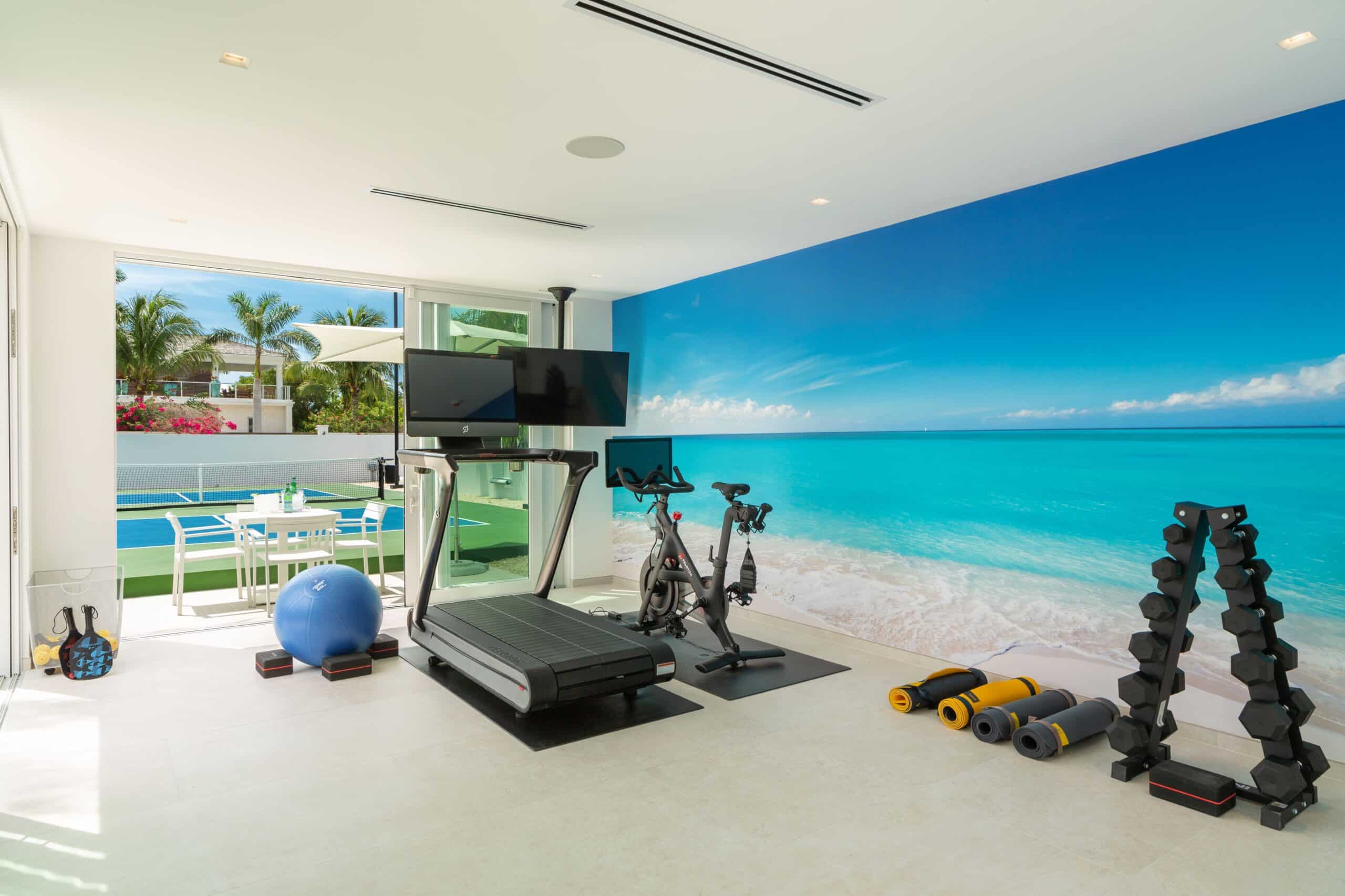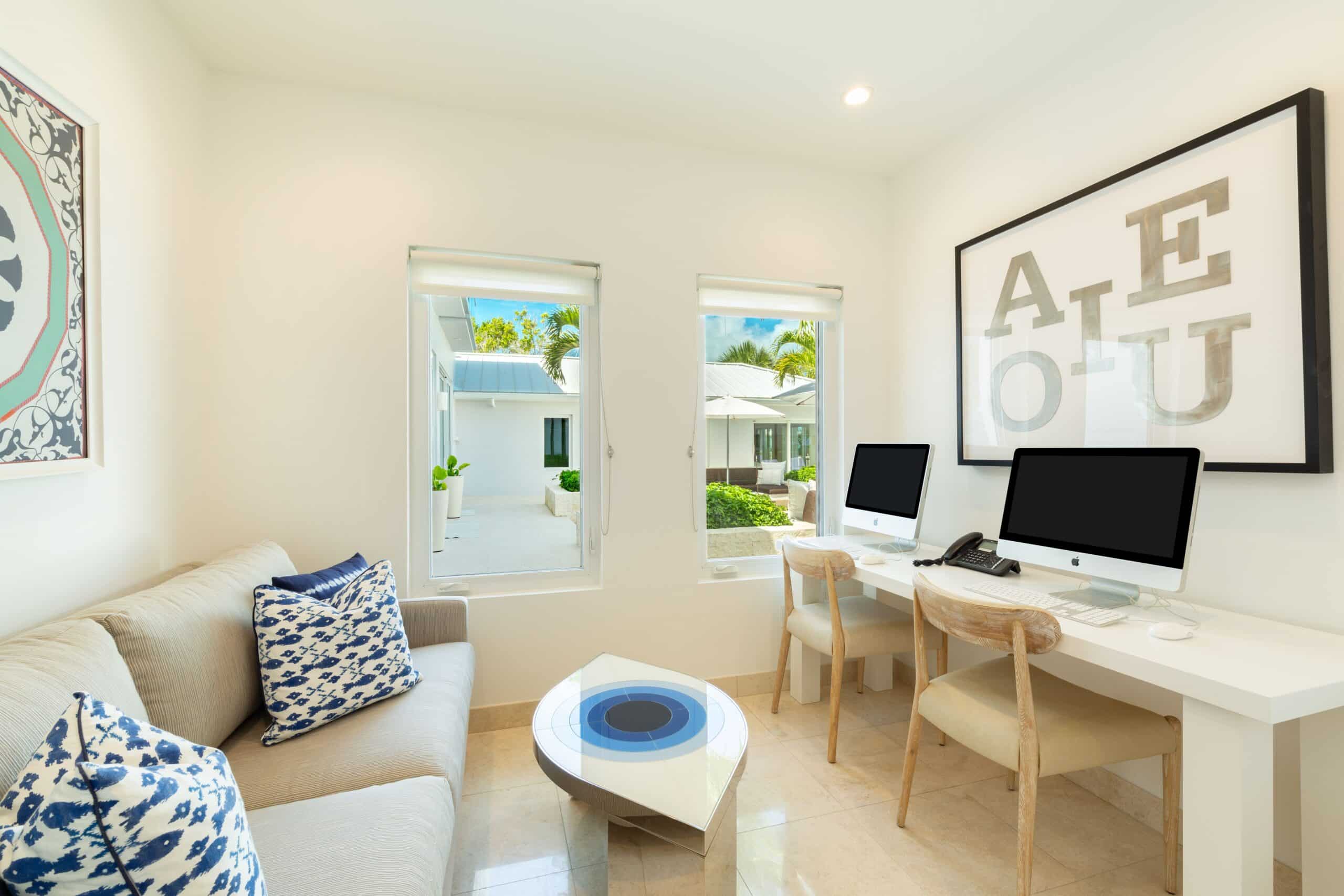 The main house is arranged across two floors, with a spacious ground-floor living room anchored by an 85-inch television and a separate upper-level casual lounge with its own oceanfront outlook — a natural gathering point at the end of the day. A chef’s kitchen and a separate guest kitchen ensure the villa is equally suited to a fully staffed stay or a more self-directed one, and a 13-foot dining table provides the setting for unhurried group meals. A dedicated office with desktop computers, a full gym with Peloton bike and treadmill, and a spa room with massage facilities and a full bathroom round out the interior offering. High-speed Wi-Fi and a SONOS sound system run throughout the property, indoors and out.
