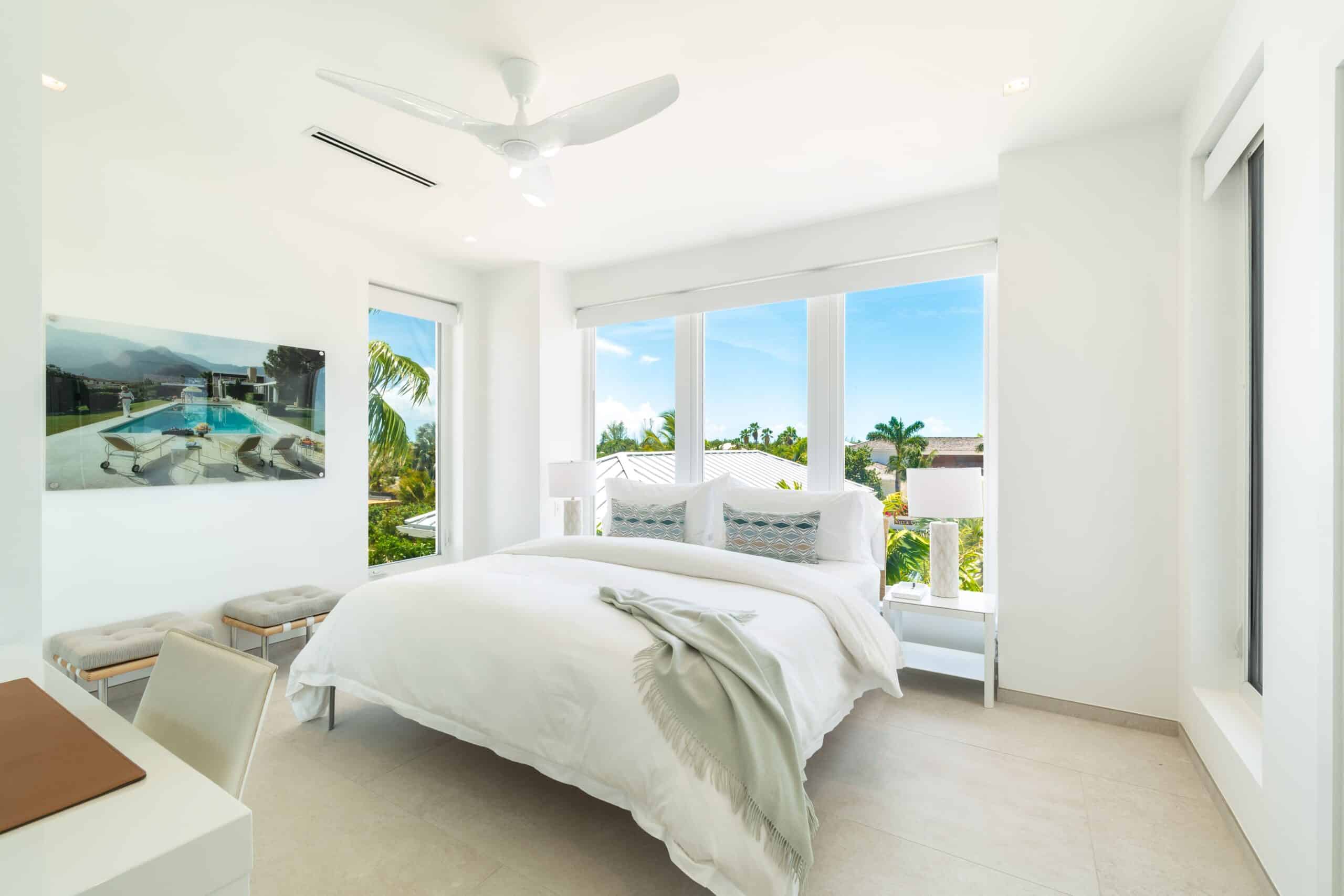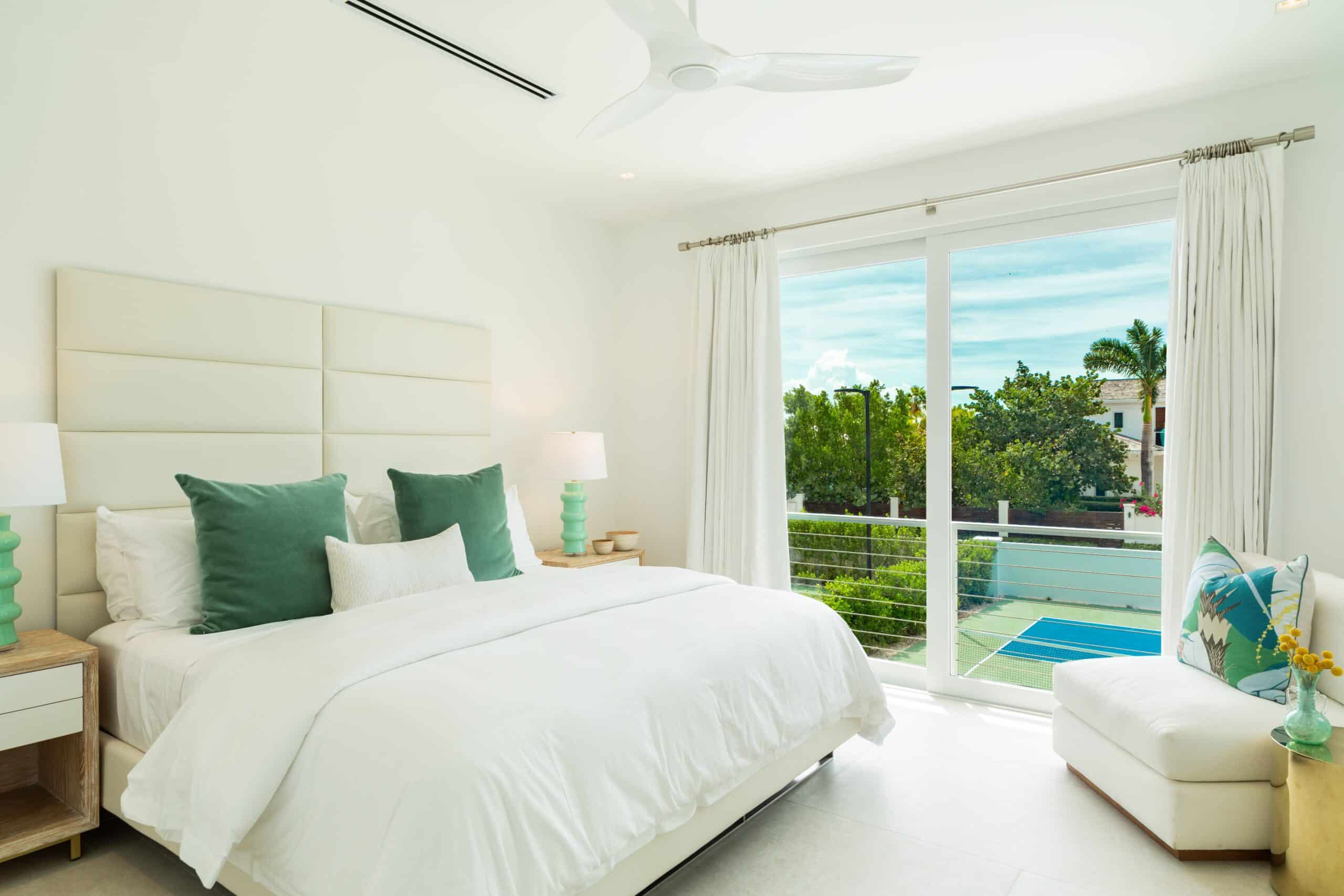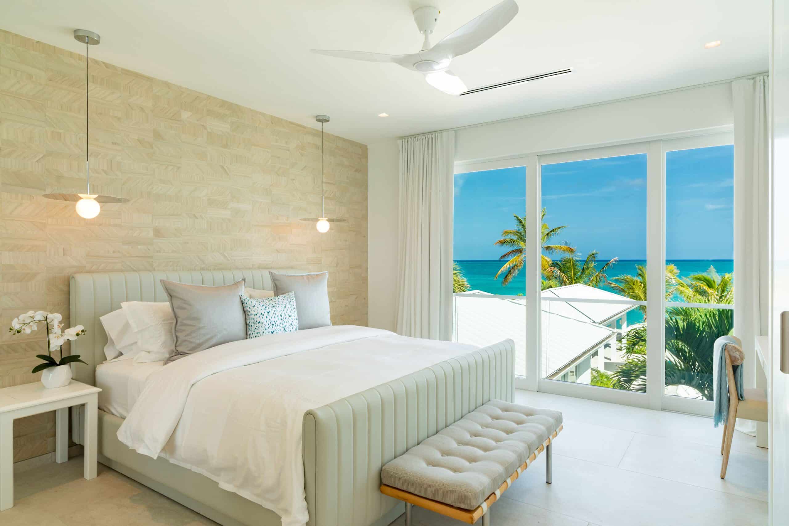 On the first floor, two further primary bedrooms — West and East — both offer king beds, ensuite bathrooms, ceiling fans, and ocean or ocean and pool views, while a sixth bedroom offers a king bed with garden views and an ensuite.