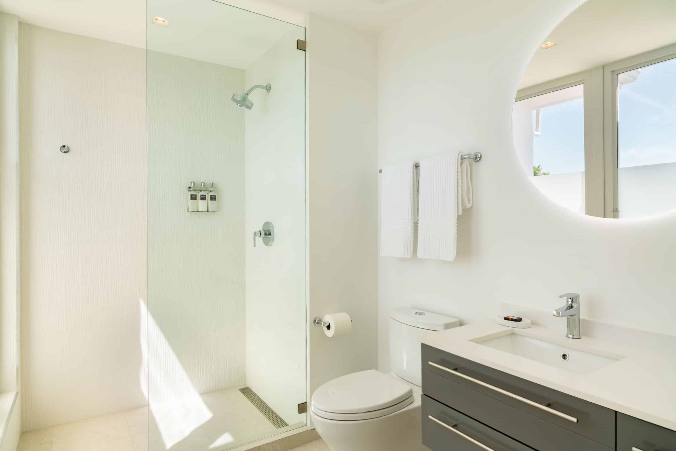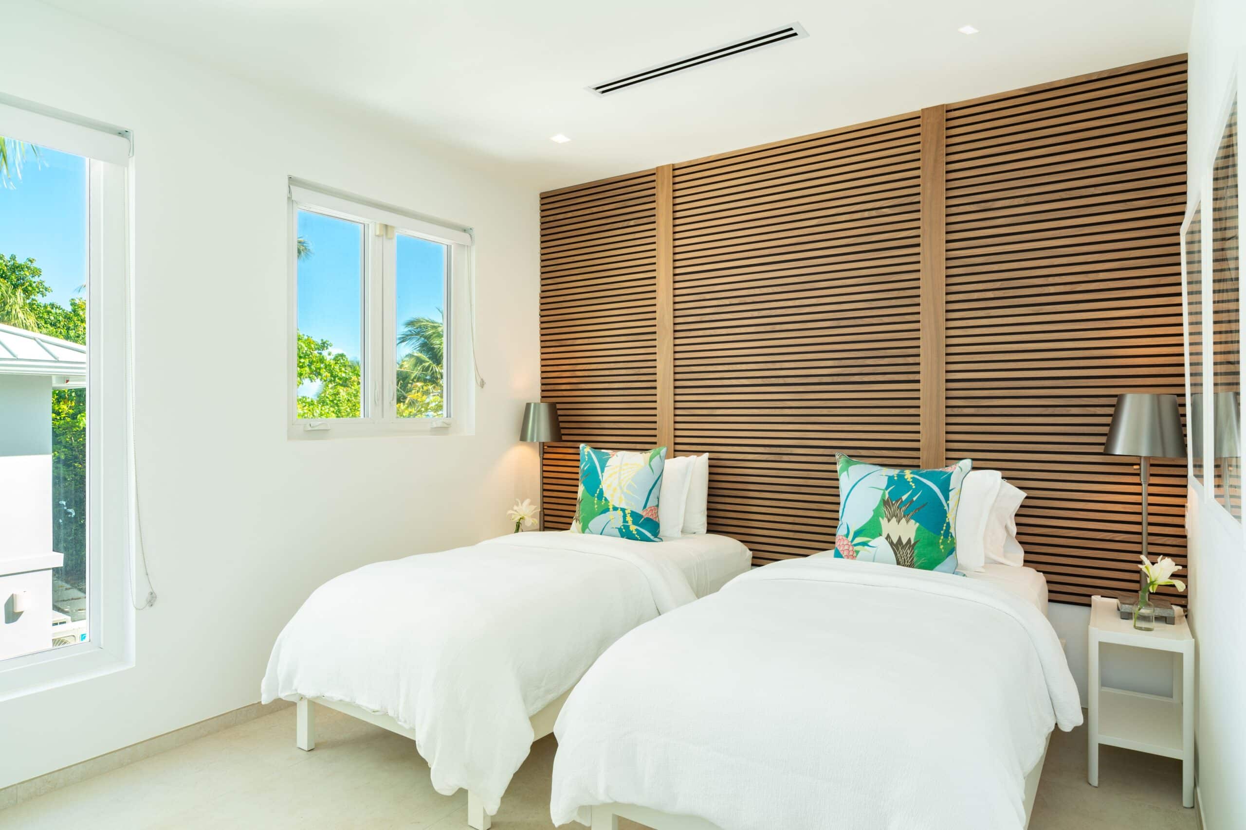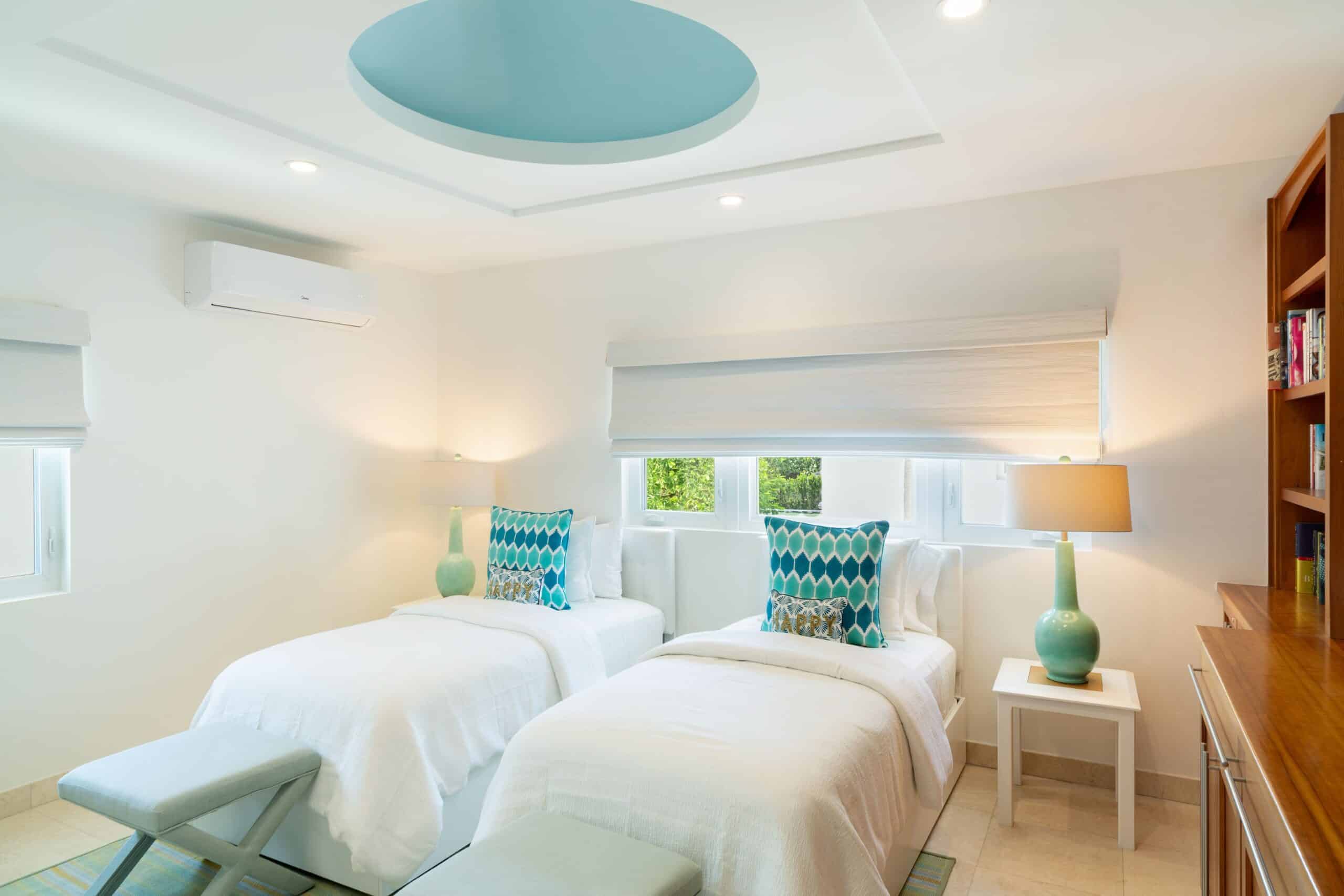 On the ground floor of the main house, the West and East primary bedrooms each offer a king bed, ensuite bathroom, ocean and pool views, ceiling fan, and direct access to the outdoor living areas. A third ground-floor bedroom offers twin beds convertible to a king, with its own ensuite and garden outlook.