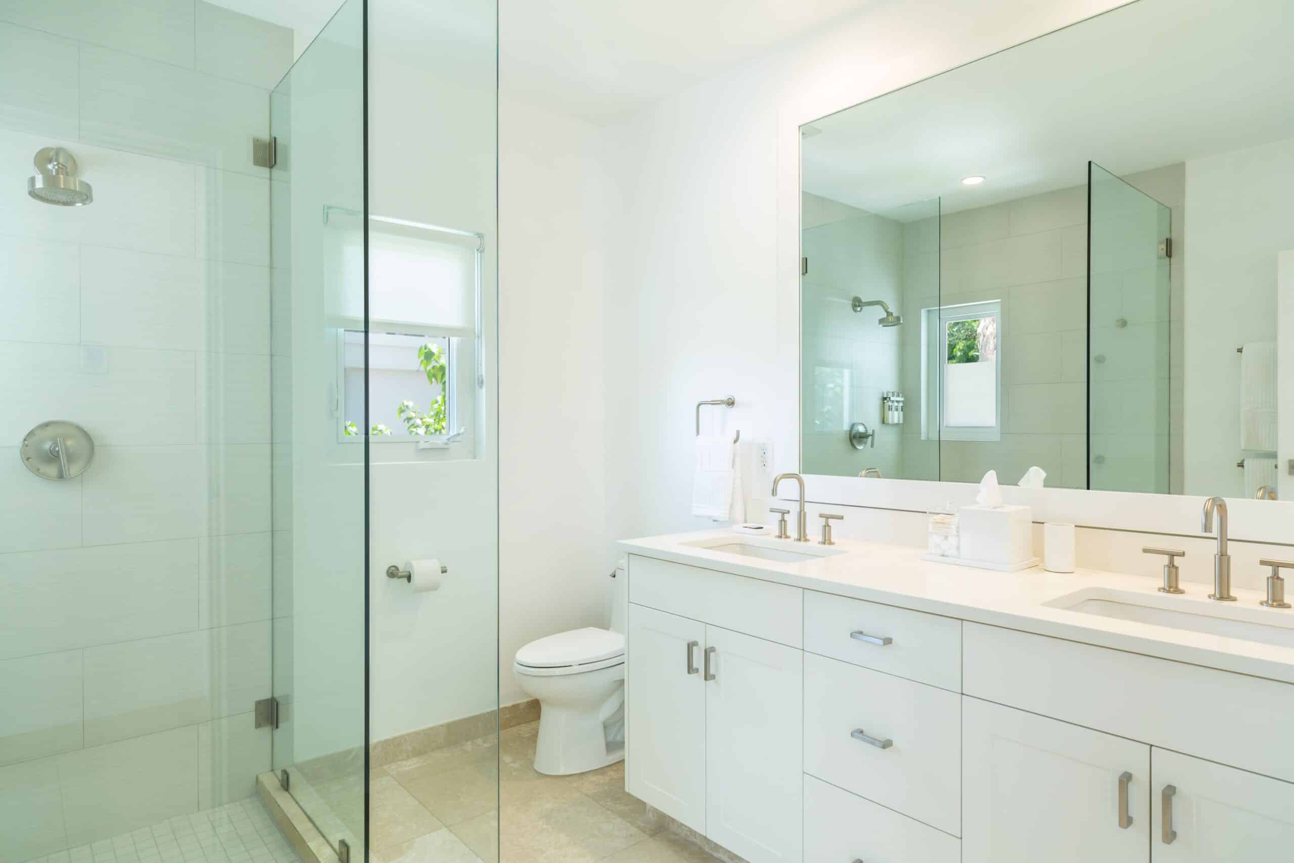 The detached guest house provides two additional bedrooms, one with a twin or king configuration and garden views, and one with a king bed overlooking the garden and pickleball court.