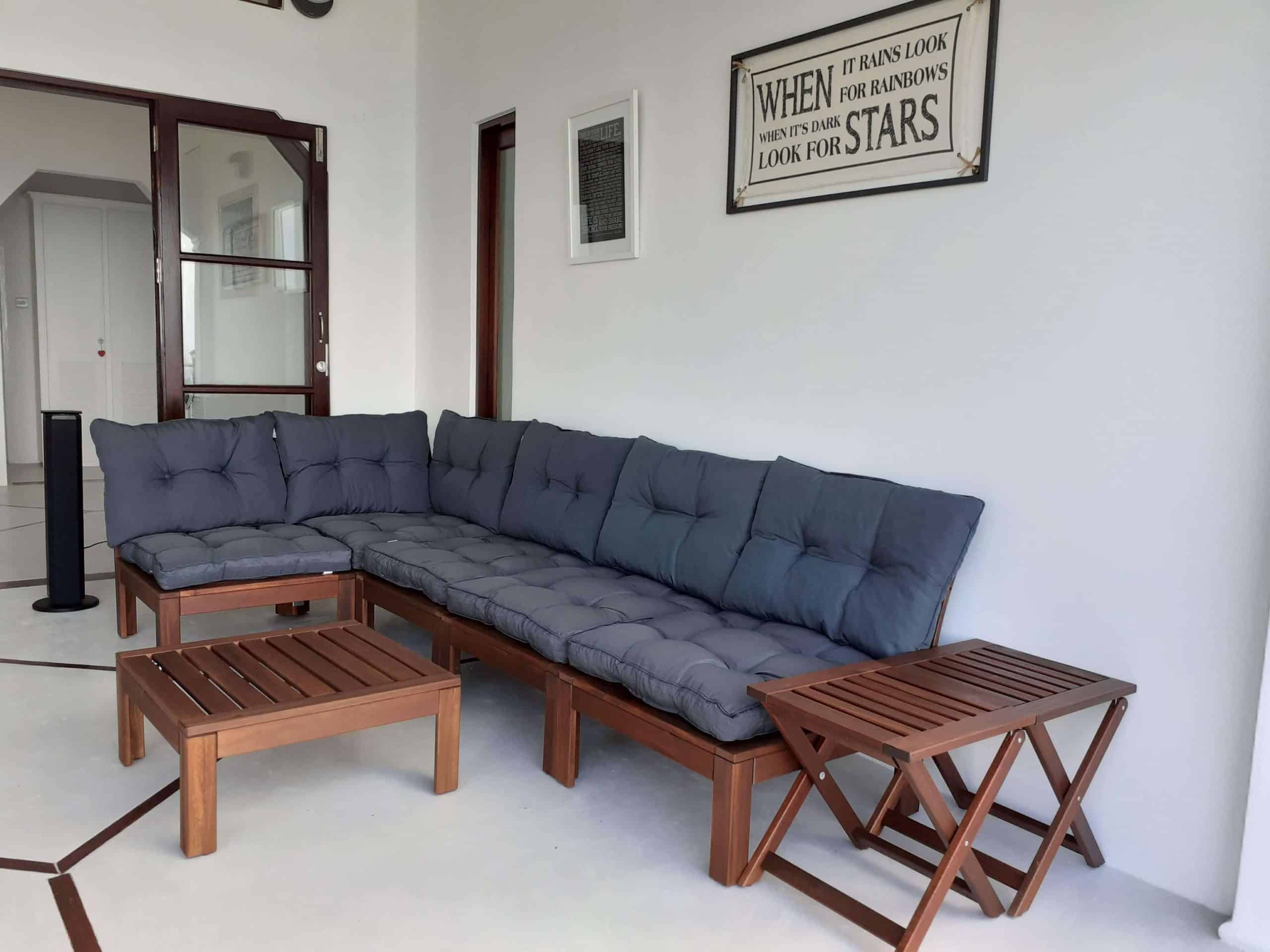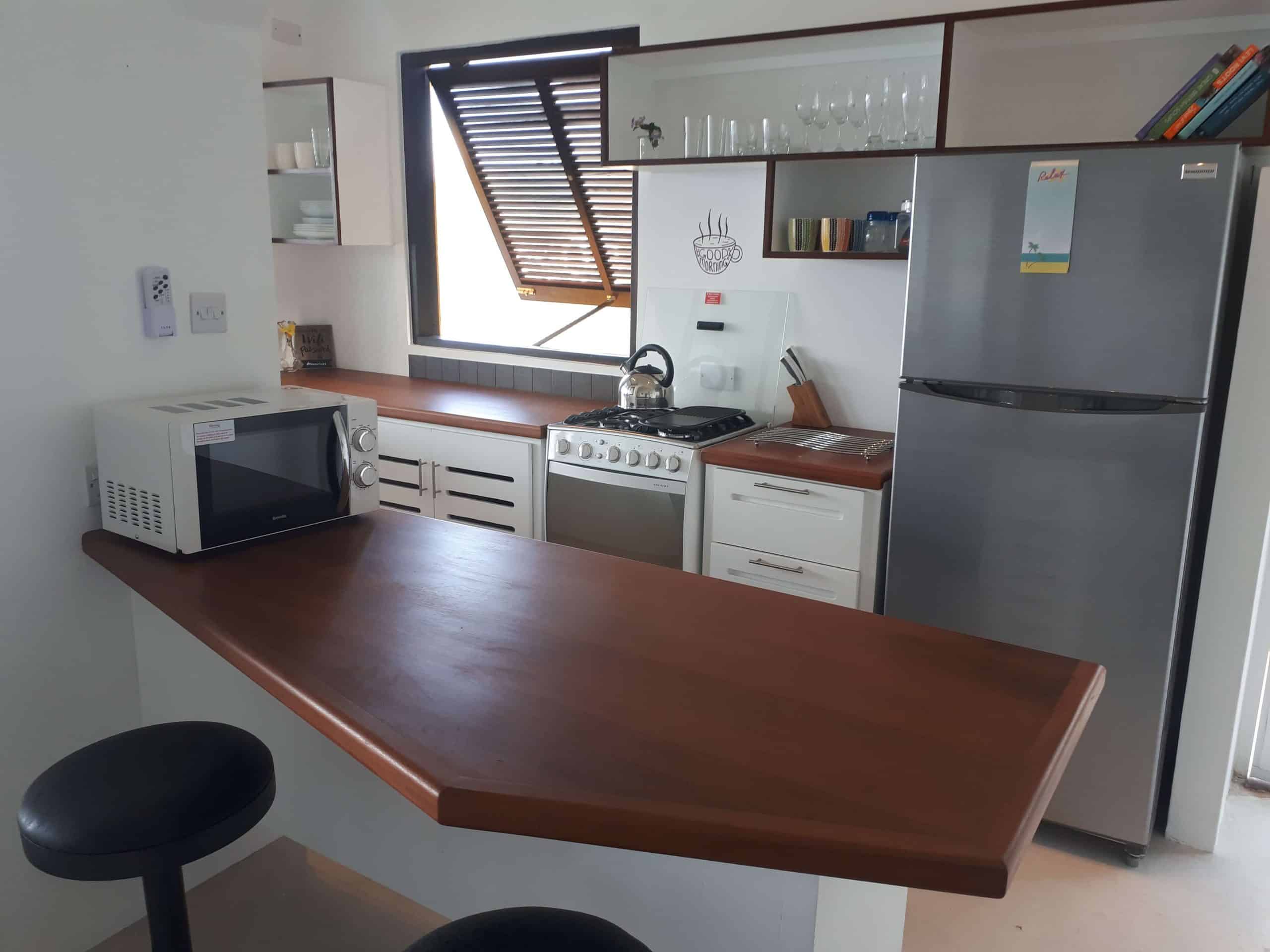 In the apartment’s main living area lies a well-equipped kitchen, with a gas cooker, fridge freezer, microwave, tea & coffee making facilities & all the home comforts. The thoughtfully designed, large windows allow guests to admire the view from every angle. This facility provides the convenient option to cook and dine in privacy (or the helpful villa owners can organise a private chef if desired). The kitchen opens into the ample living space with a breakfast bar, twin sofas, chairs, dining table & benches. Lines are blurred between outdoor & indoor living as the main inside living area is separated from the outdoor space by beautifully designed mahogany folding doors that can be removed entirely to the side. There is high-speed WIFI and a Bluetooth tower speaker so guests can stream their favourite music throughout the apartment. A mobile phone with credit and a welcome pack with groceries plus wine & beer are provided.
