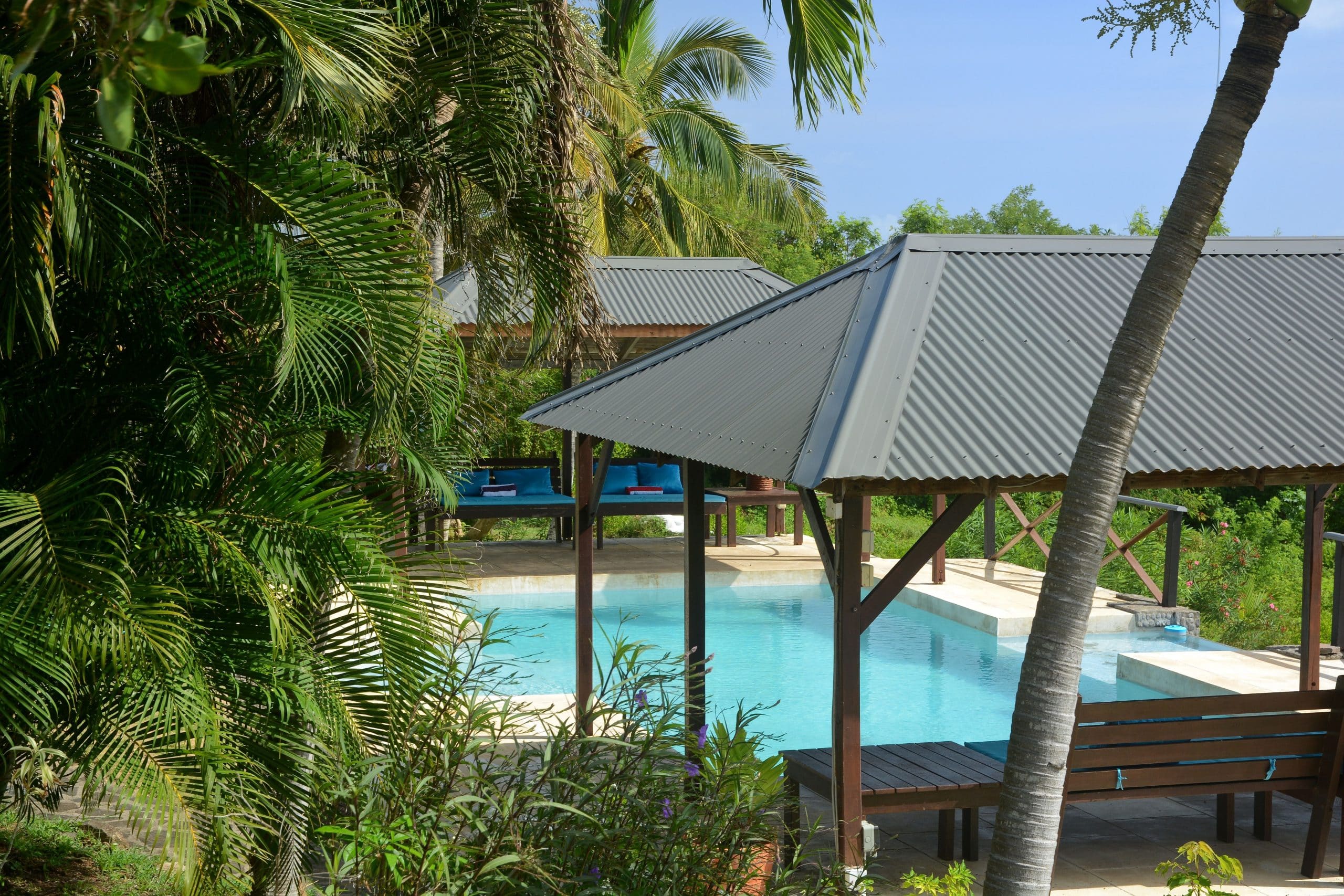 A fifth suite is in a separate building above the outdoor bar and pool area. It features a queen-sized bed with an en-suite bathroom and a private balcony with views of the Grenadine Islands, including Grenada, on a clear day. This room has a fan.