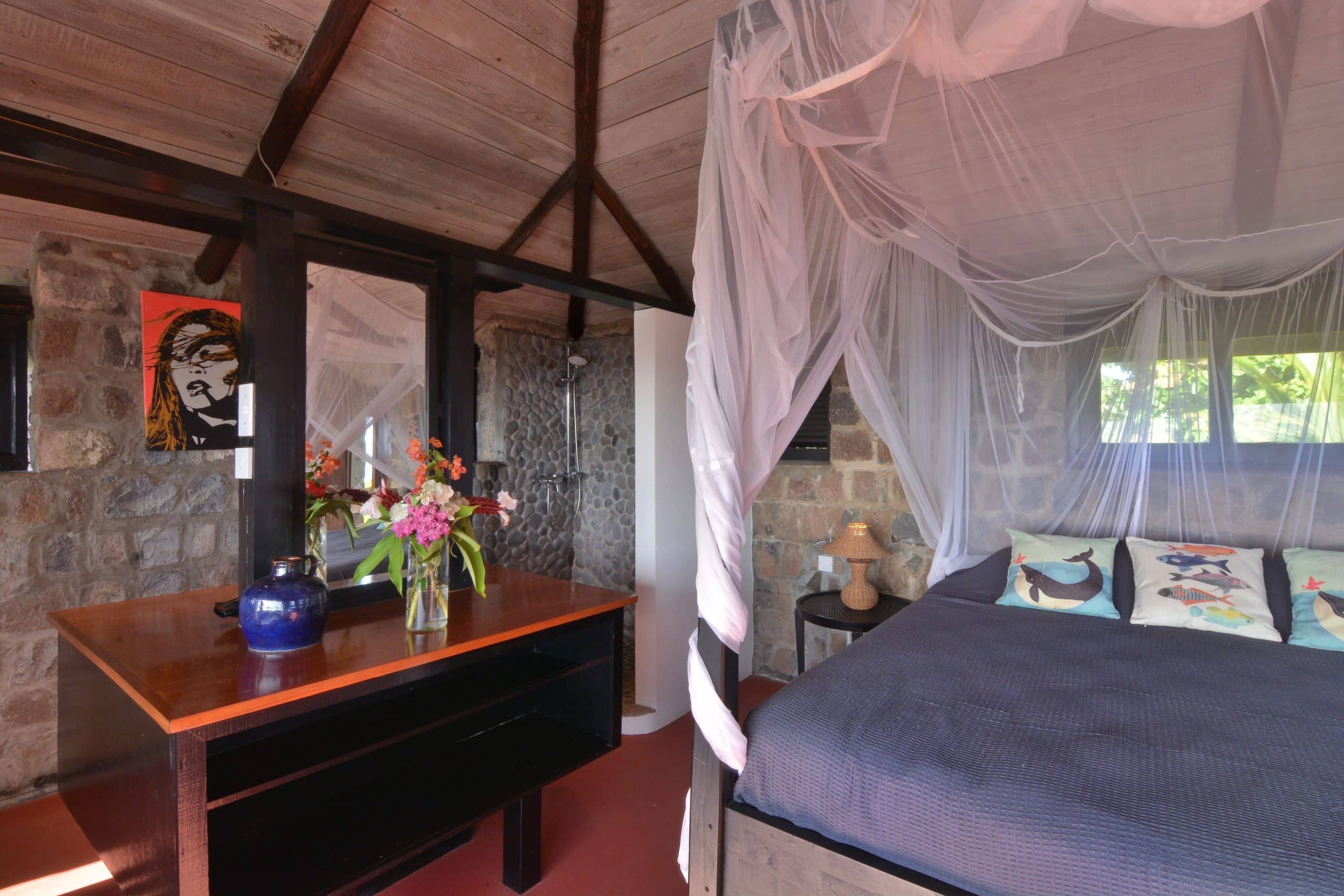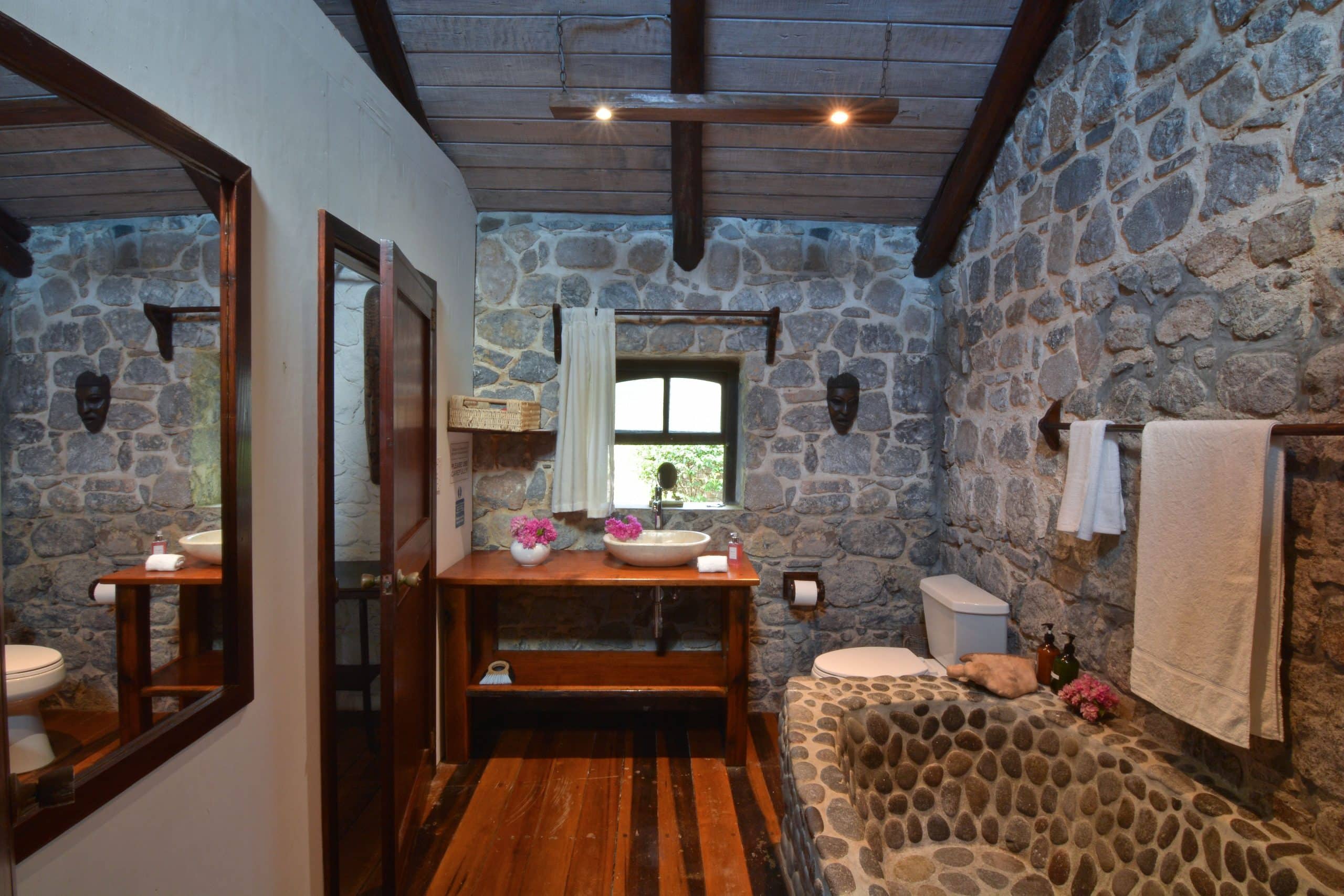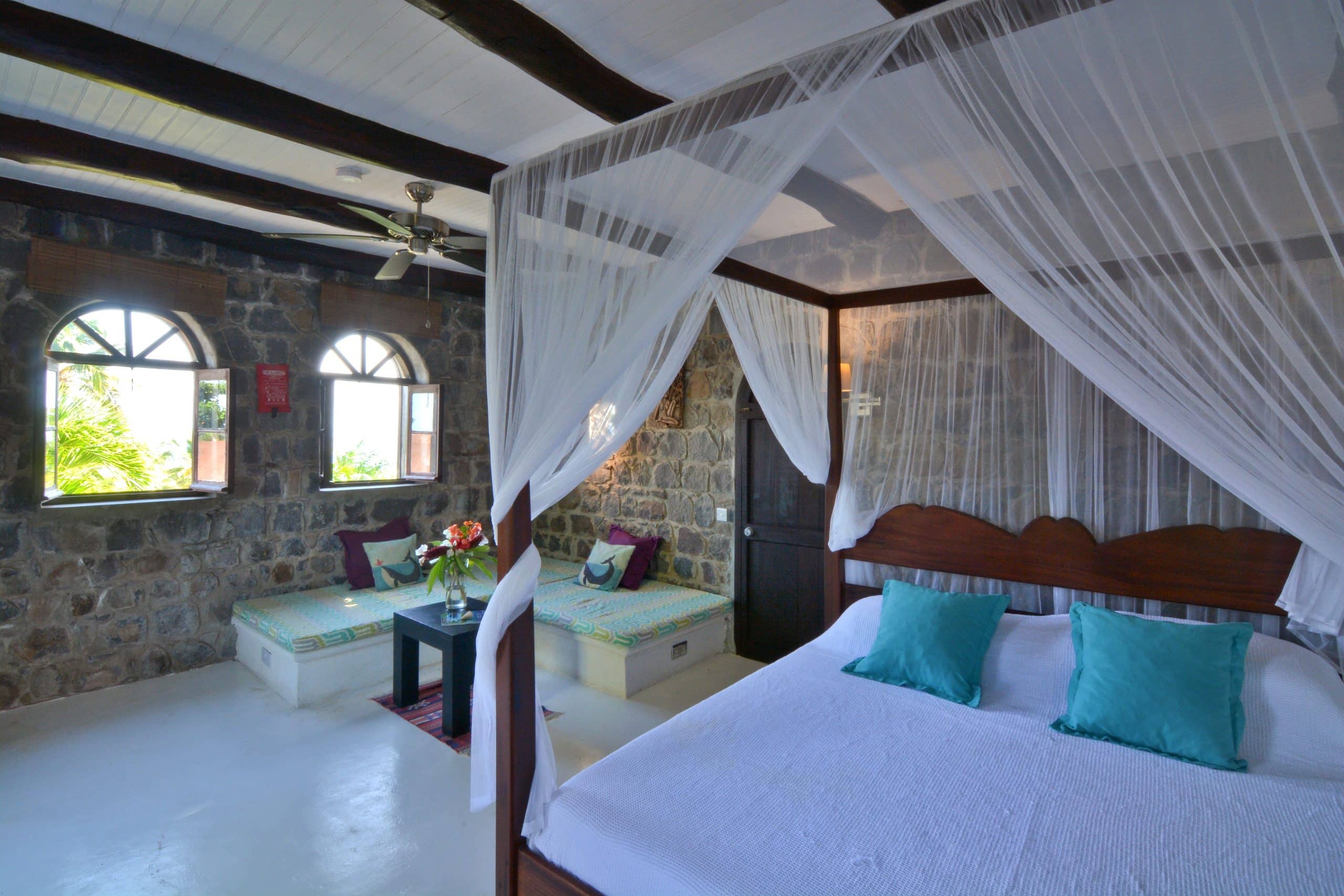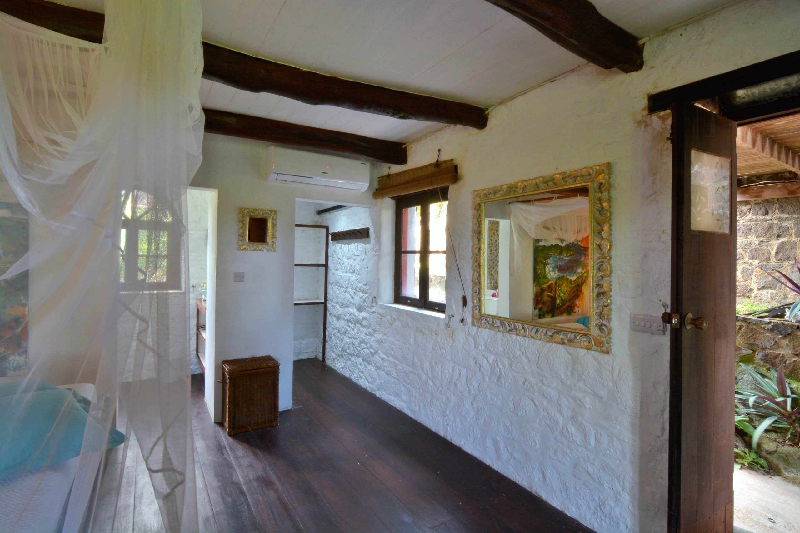 Sugar Mill House is a true gem in the heart of the Estate, providing guests with a unique blend of comfort, style, and history. So whether you’re looking to relax and unwind or explore the Estate’s rich history, Sugar Mill House is the perfect place to call home during your stay. Guests can totally relax in the spacious, beautifully appointed en-suite bedrooms, each featuring a king-sized four-poster bed. The primary suite is air-conditioned and designed for ultimate comfort, with a sitting area, hardwood vanities and stunning marble and glass sinks. The en-suite bathrooms have generous pebble showers, including a unique circular open-air design in one bedroom, offering a spa-like atmosphere while maintaining complete privacy. The second bedroom does not have air conditioning.