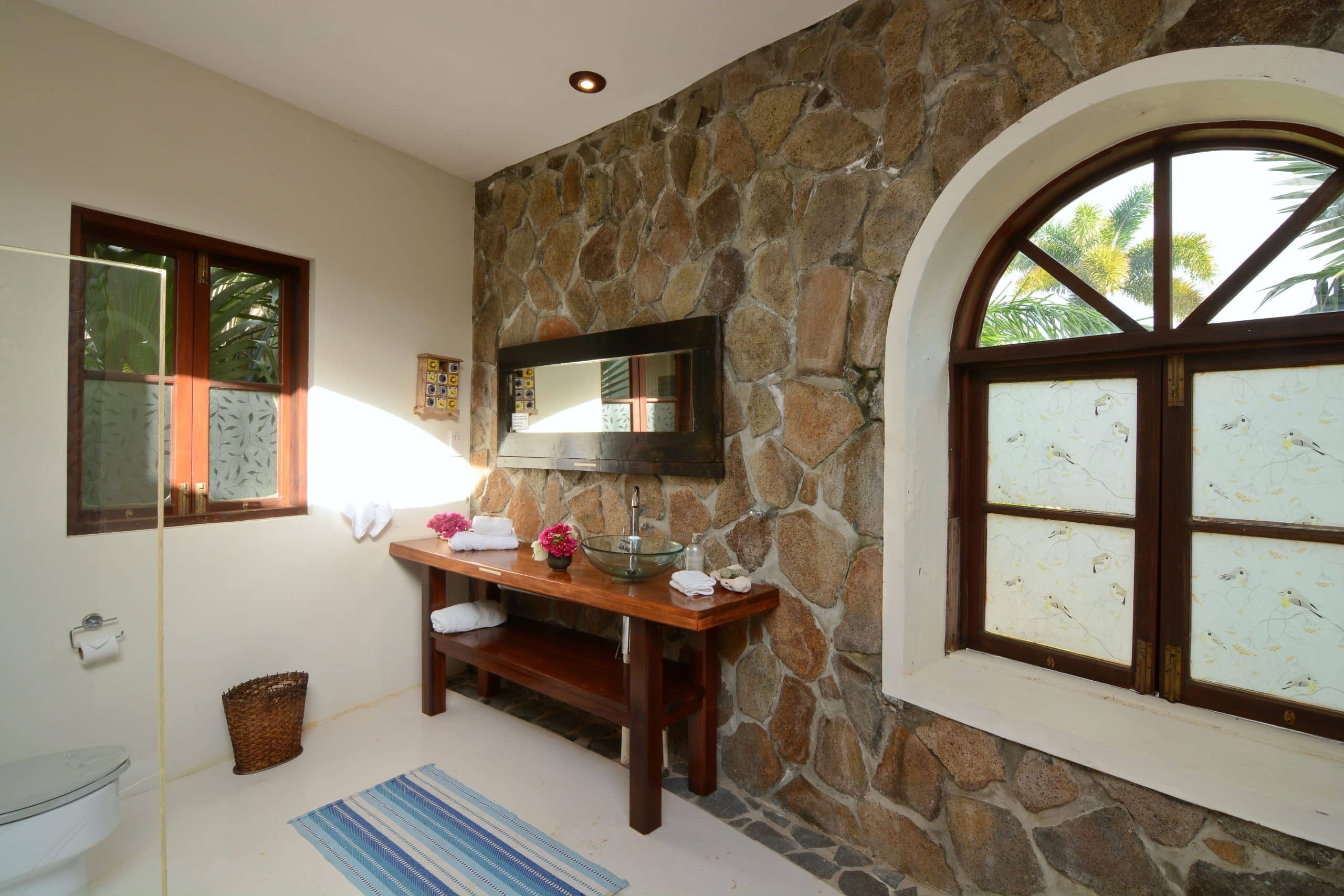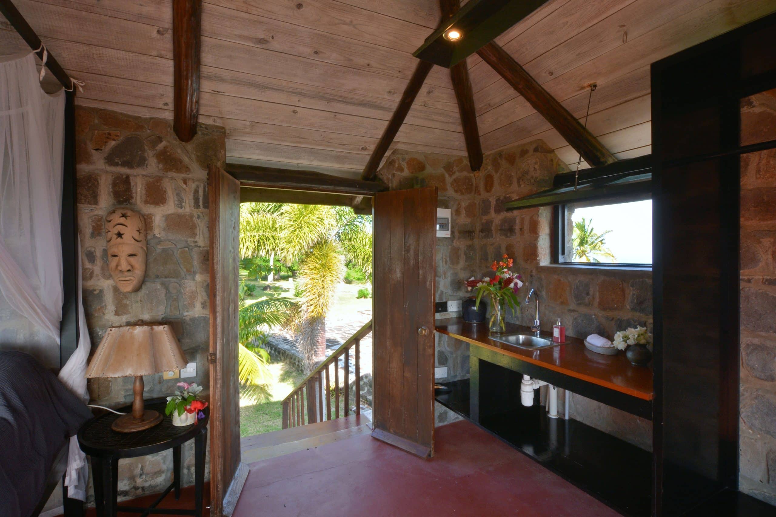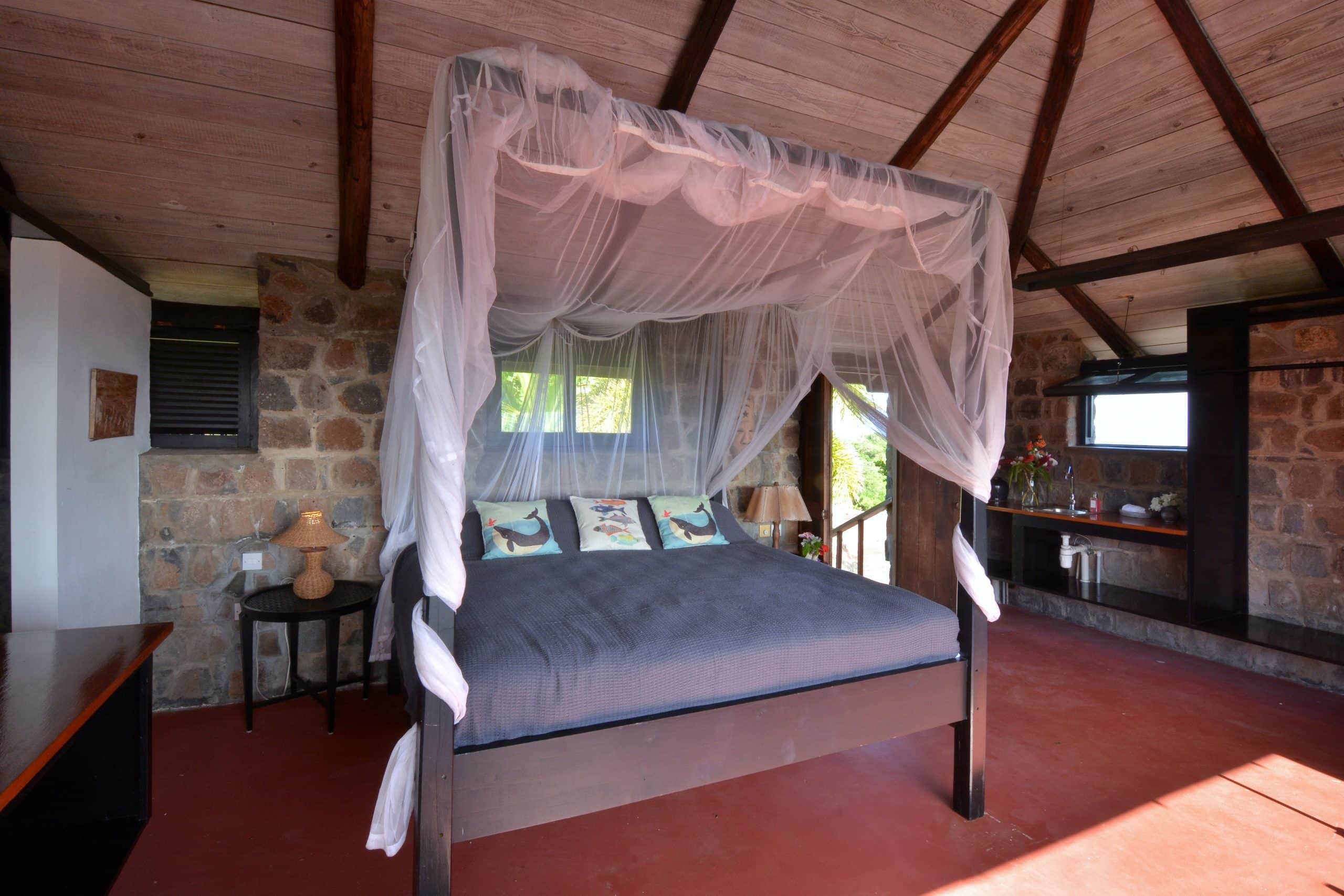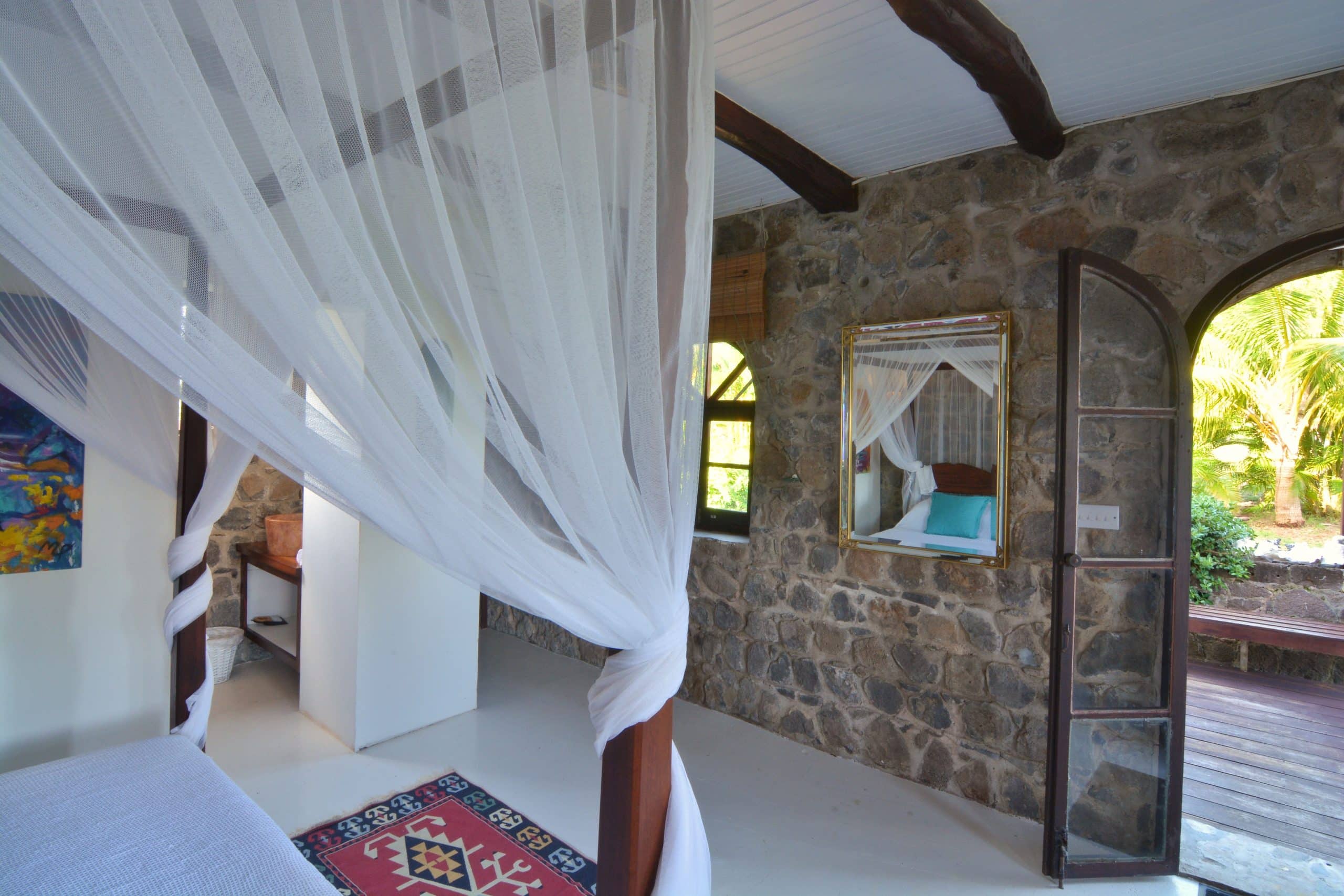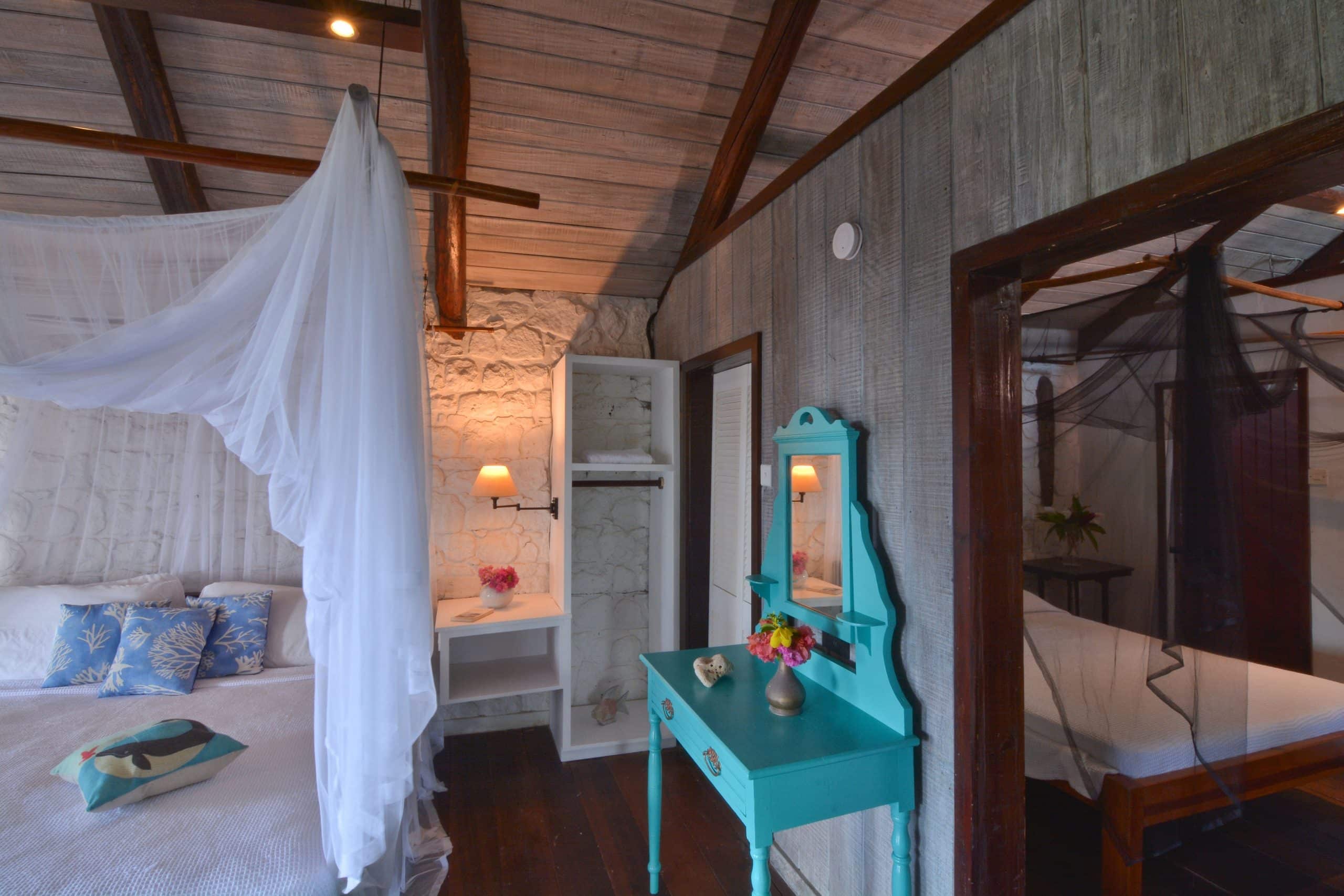Sugar Mill House is a true gem in the heart of the Estate, providing guests with a unique blend of comfort, style, and history. So whether you’re looking to relax and unwind or explore the Estate’s rich history, Sugar Mill House is the perfect place to call home during your stay. Guests can totally relax in the spacious, beautifully appointed en-suite bedrooms, each featuring a king-sized four-poster bed. The primary suite is air-conditioned and designed for ultimate comfort, with a sitting area, hardwood vanities and stunning marble and glass sinks. The en-suite bathrooms have generous pebble showers, including a unique circular open-air design in one bedroom, offering a spa-like atmosphere while maintaining complete privacy. The second bedroom does not have air conditioning.