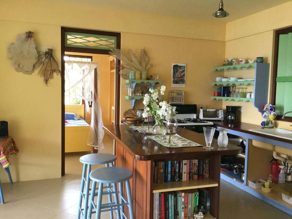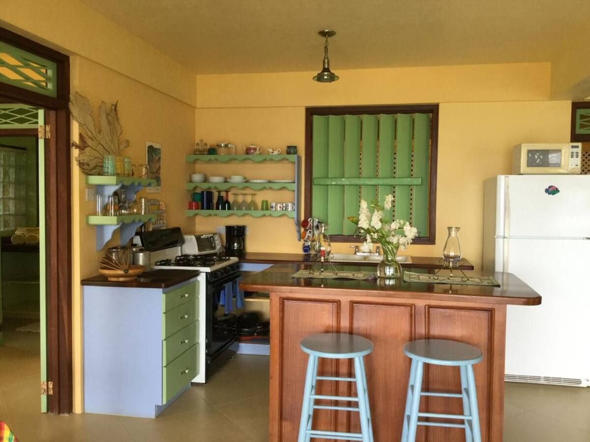 There is a large Caribbean-style living room with a comfortable couch and hammock, along with two wicker side chairs. Telephone and cable television are provided as well as both 220 volt and 110-volt electrical services. The WIFI provided is fast, reliable, high-speed cable. The open-air kitchen is well-appointed with new appliances, including a large ice-making refrigerator and a full-sized four-burner stove with an oven. In addition, there is a coffee maker, microwave, and toaster, along with a full complement of cookware, plates, glasses and utensils. The kitchen features a hardwood island with cushioned stools for early-morning coffee.