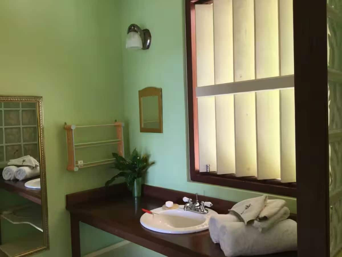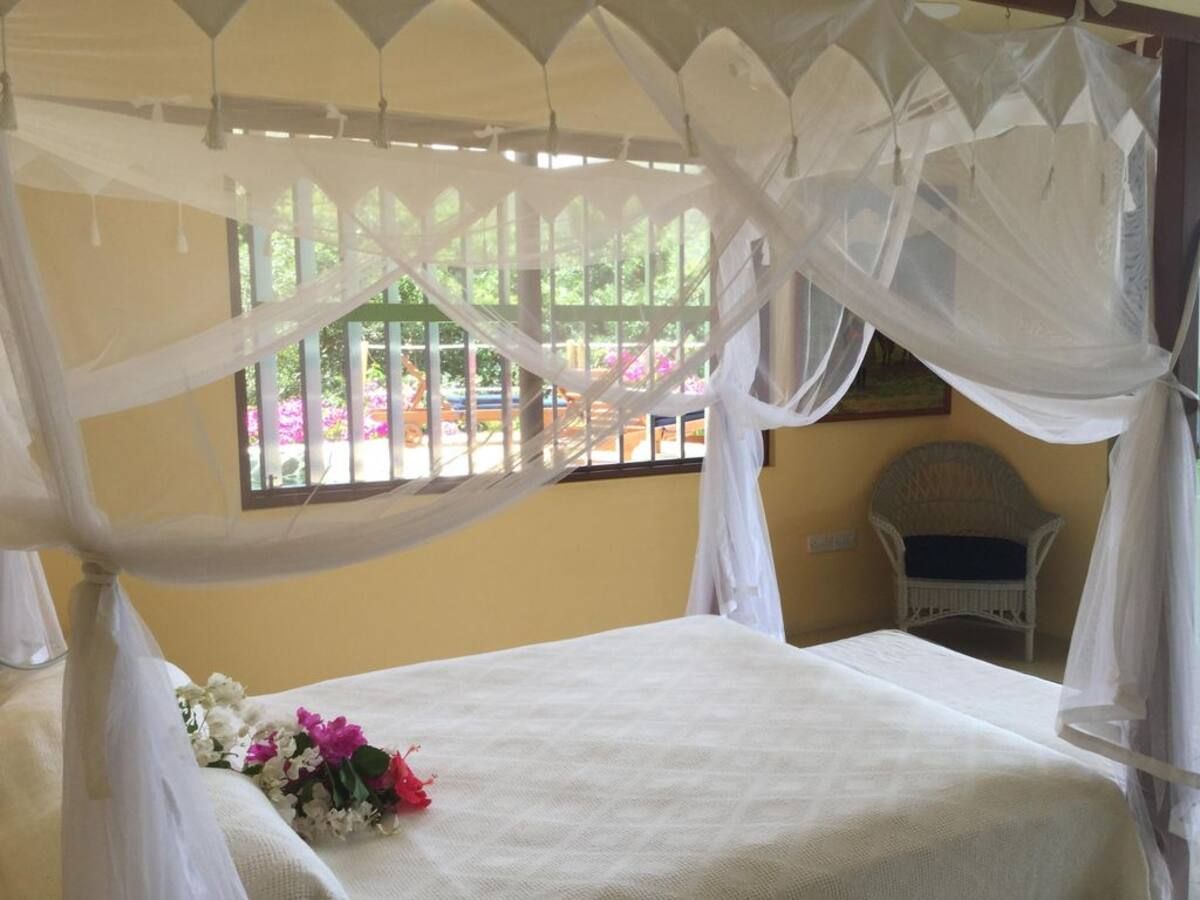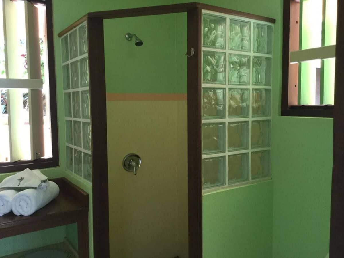 The primary bedroom has air conditioning and a queen-sized bed with mosquito nets, a day bed for an additional person (or to relax) and a generous open closet. This room has great cross ventilation, so it’s nice and breezy; new overhead fans have recently been installed for additional comfort. The en-suite bathroom is large, with hardwood counters and a shower with glass bricks to let in light. The second bedroom has air conditioning and a newly installed ceiling fan. The bedroom has two comfortable twin beds with mosquito nets, ample closet space, and an en-suite shower room plus a washbasin.