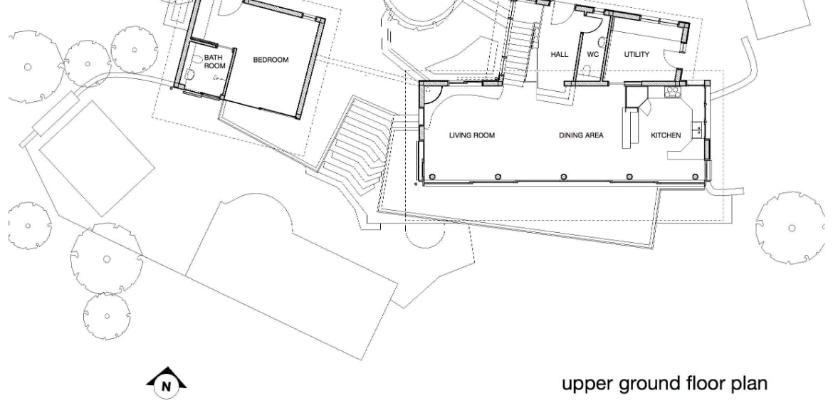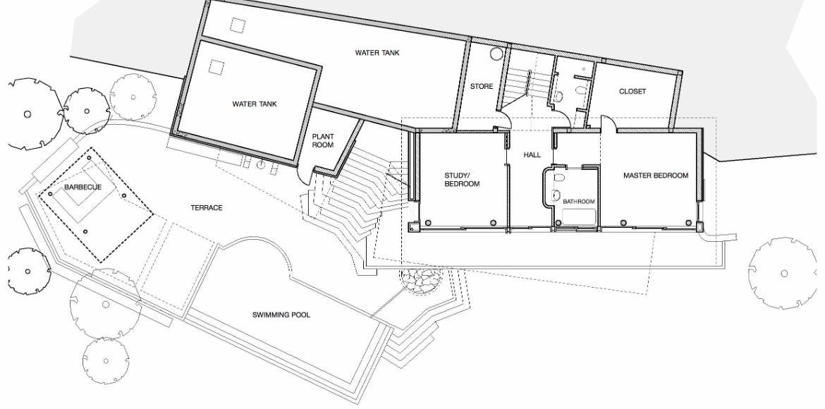 On the lower level, two spacious air-conditioned bedrooms each feature large glass doors that open to a shaded verandah with direct pool access. One bedroom includes an ensuite bathroom and dressing area, while the other is adjacent to a large shower room and storage space. All rooms are light-filled and designed to maximize connection to the surrounding landscape.