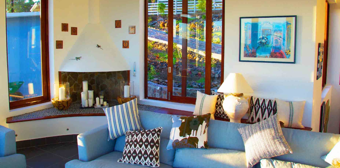 The upper floor of the main house features an expansive open-concept living area with a fully equipped kitchen, fitted with premium Bosch appliances and a Scandinavian-style cold store. Floor-to-ceiling sliding glass doors frame the panoramic views and open fully onto a generous terrace that overlooks the pool, gardens, and Crescent Bay.